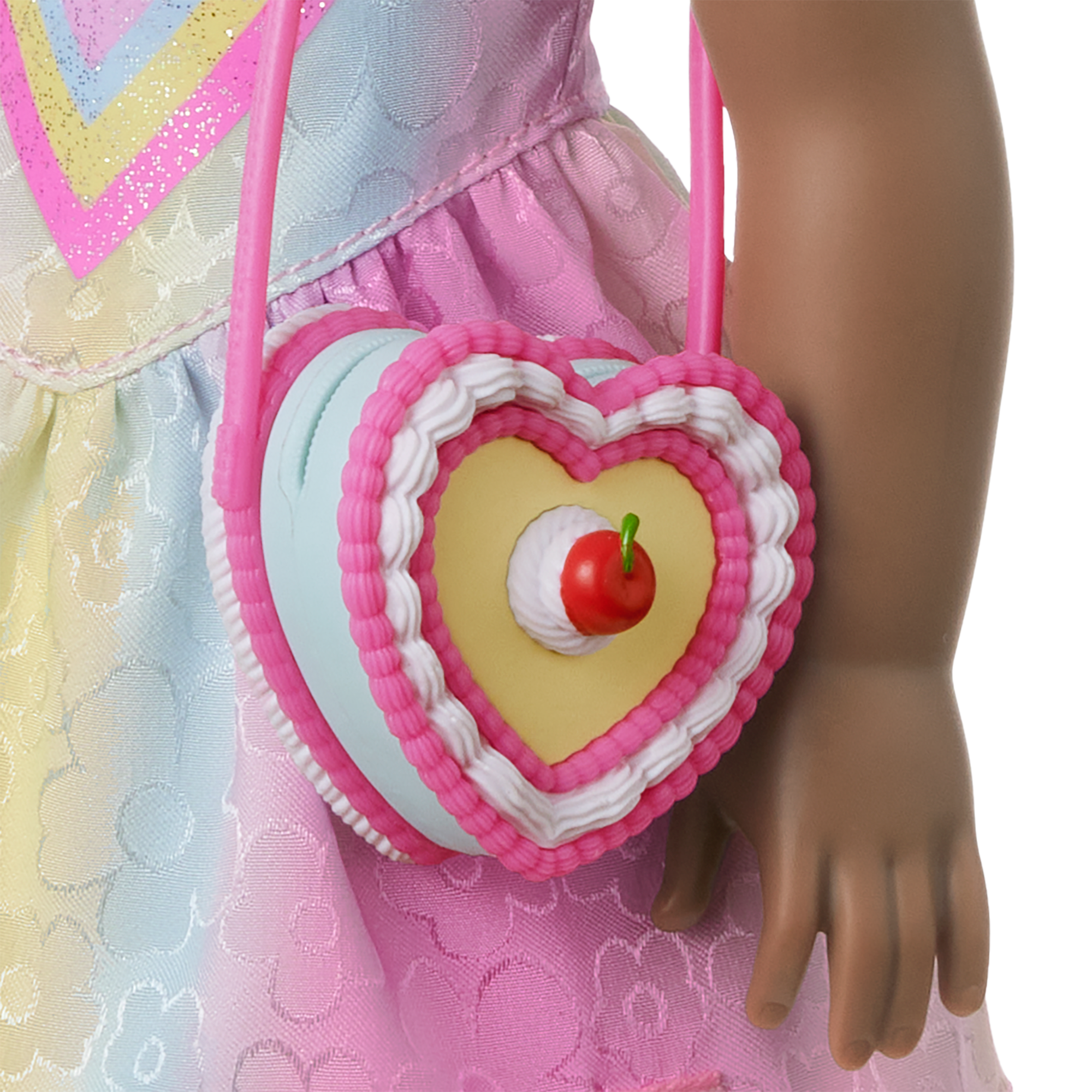A pastel ombre dress with a textured floral fabric and multicolored heart graphic on the bodice, a yellow headband with a heart, and a pair of yellow platform Mary Jane shoes