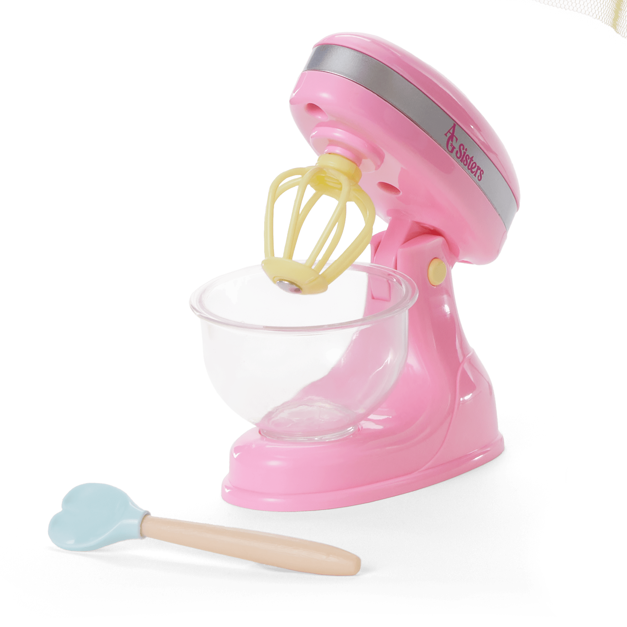 A pink stand mixer with a clear bowl and a blue heart-shaped spatula