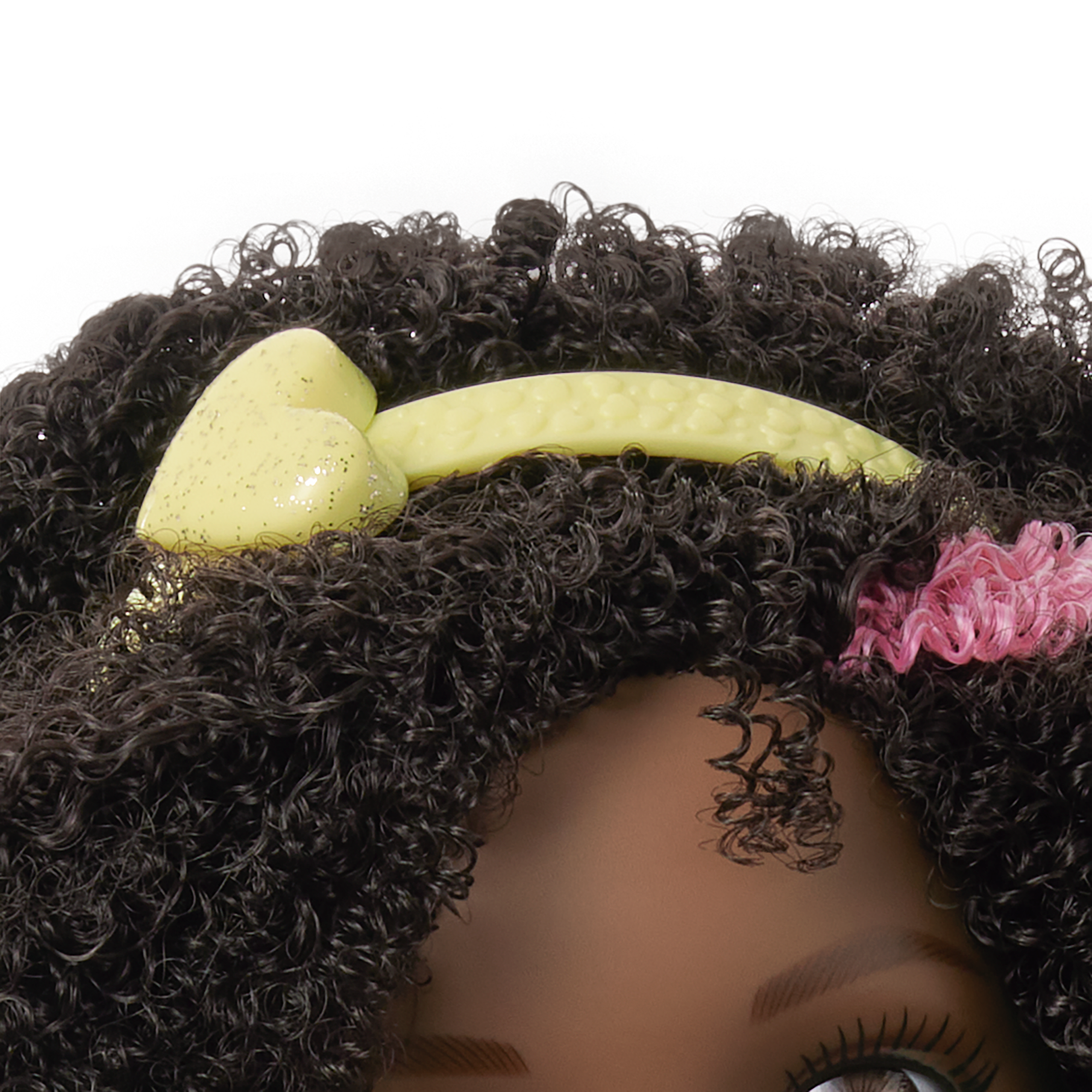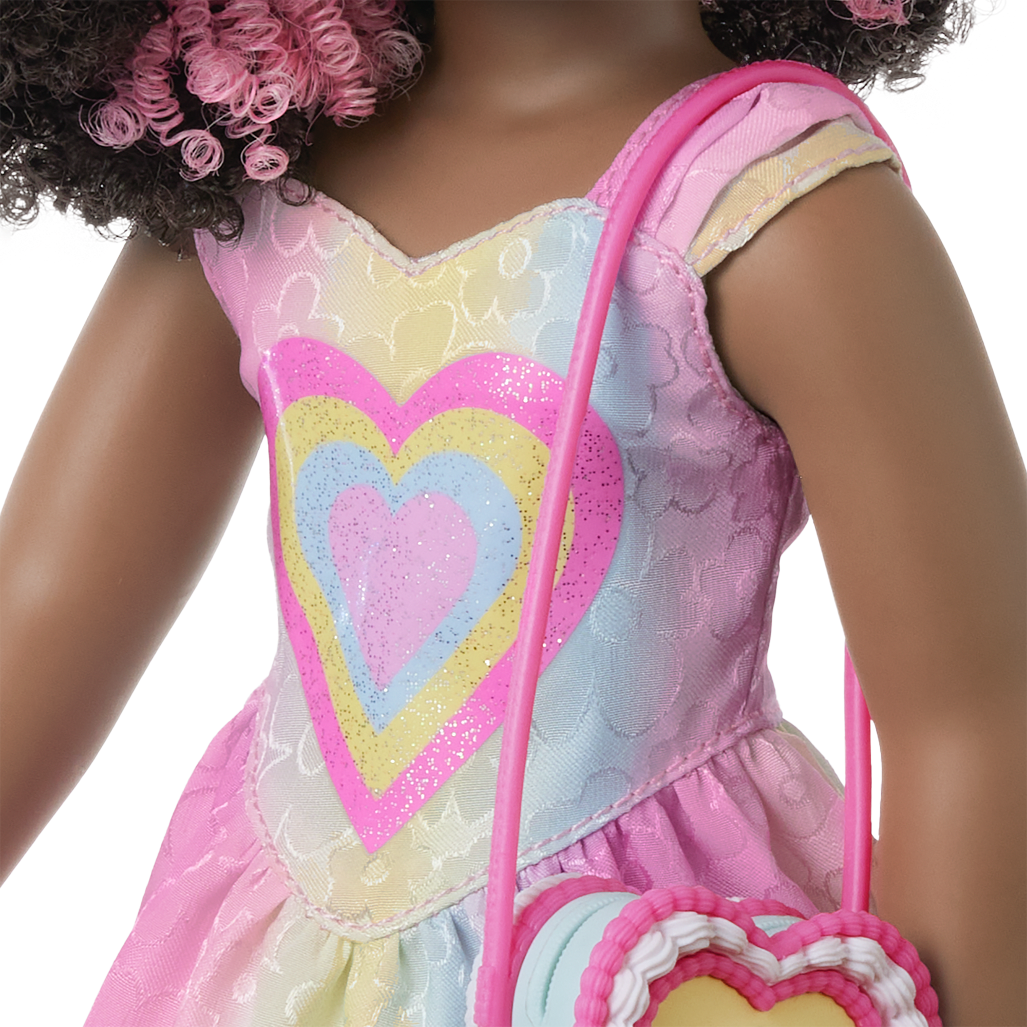 A 14.5″ Wesley doll that is sized just right for younger girls. She has brown eyes, pink heart earrings in her pierced ears, and short curly dark-brown hair with light-pink highlights.