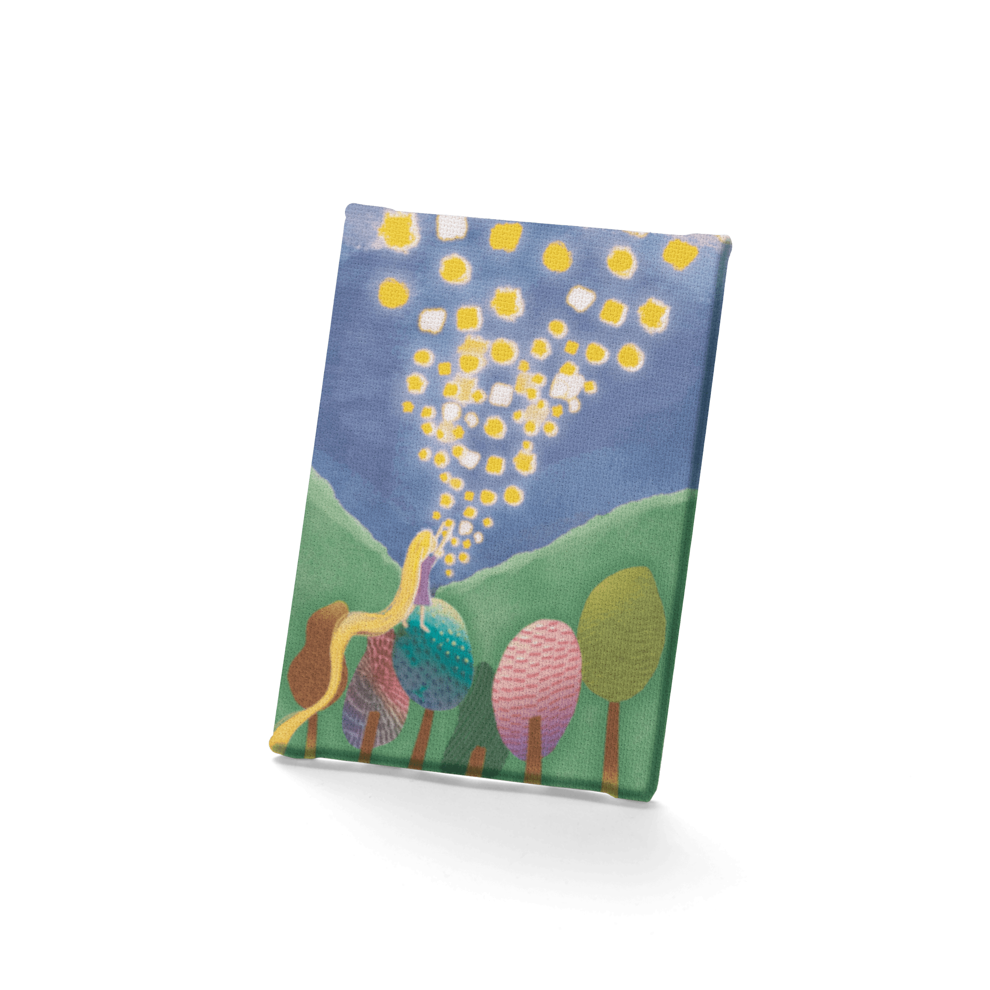 A color-reveal faux canvas that displays Rapunzel-inspired artwork. Painting on the canvas with water reveals the image, which disappears when the canvas dries.
