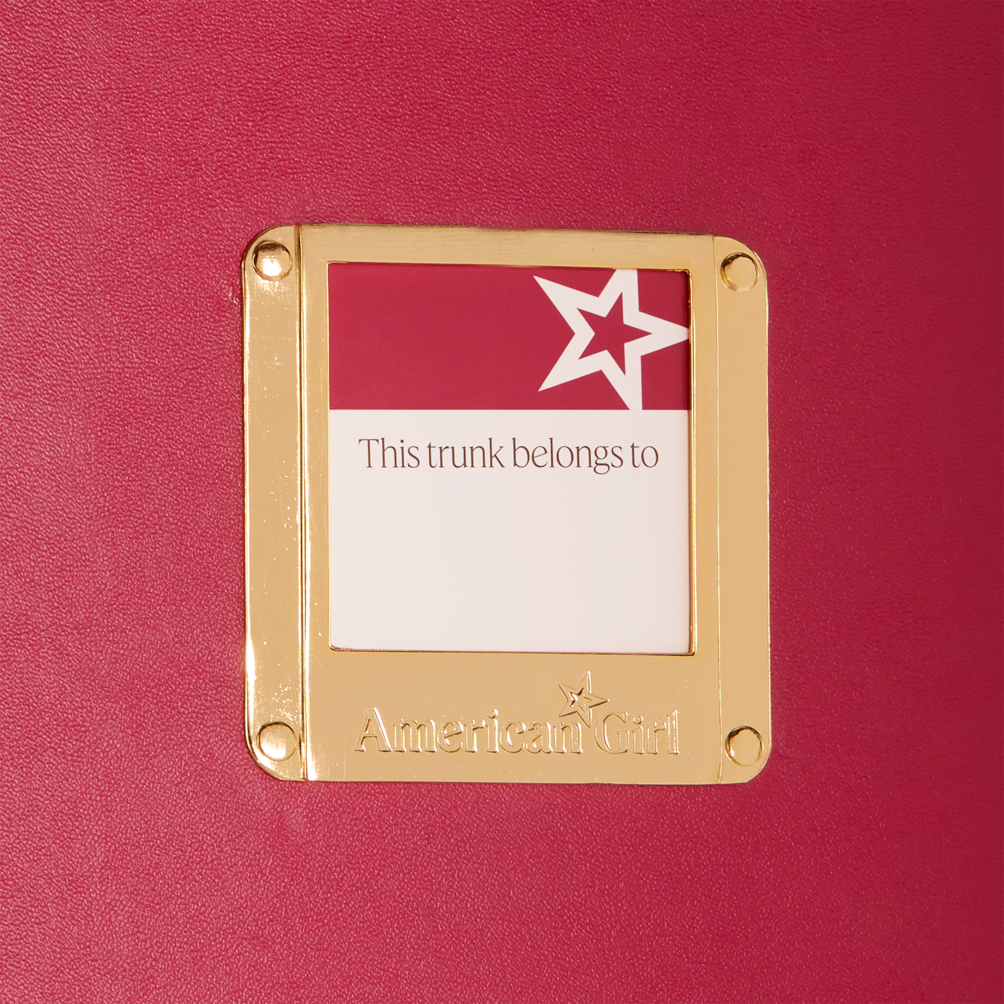 An AG signature berry-colored wardrobe trunk featuring white strapping details, a gold latch closure, a gold nameplate holder with a customizable name tag, and a gold AG logo badge on the exterior. The interior features a gold foil AG logo print and two-sided storage. One side features an open compartment for larger items-use the clothing rod and three hangers for storing outfits or secure a doll in place with the strap. The other side features three drawers to house accessories, plus a square mirror at the top for doll dress-up play.