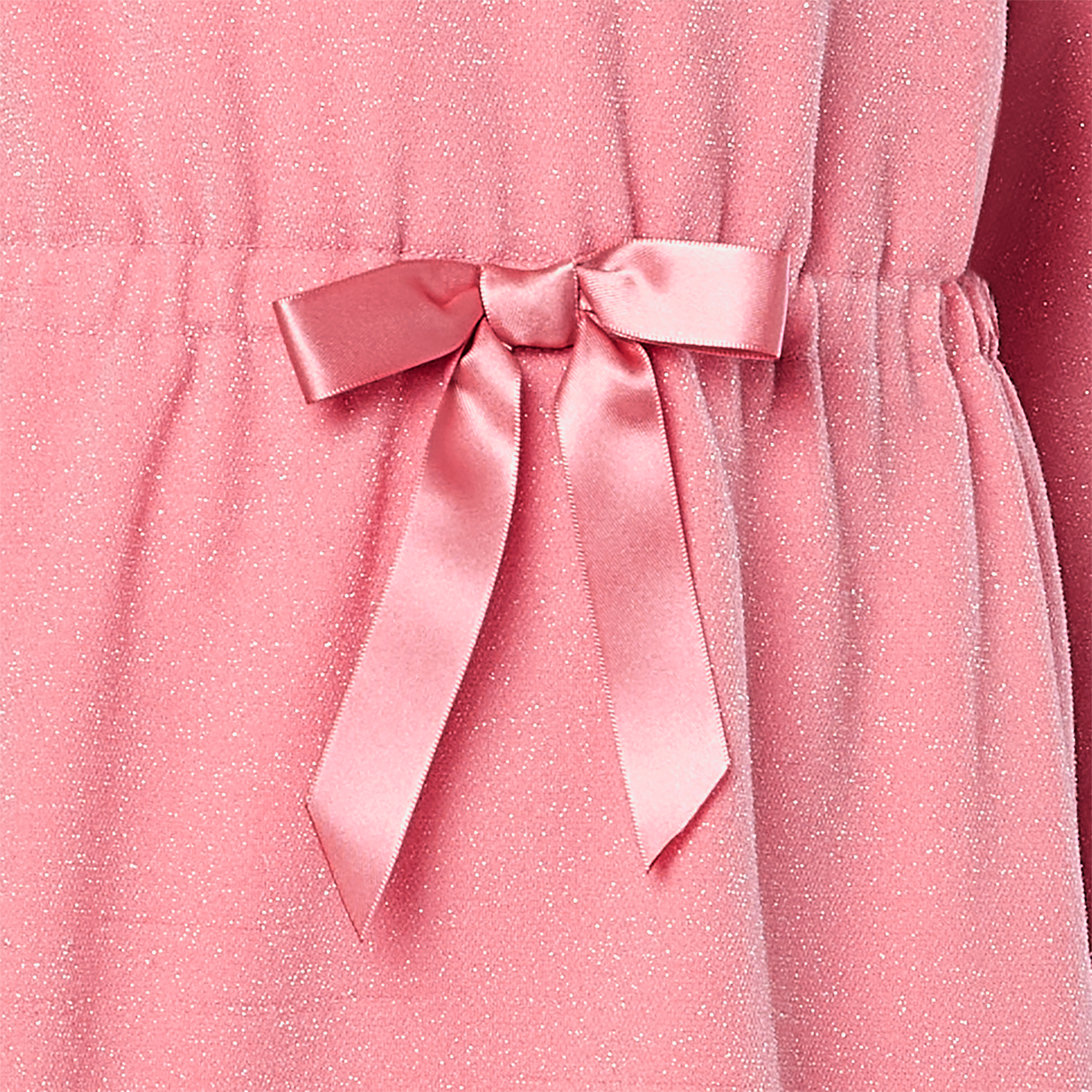 A rosy-pink sparkle knit dress with a ruffled neckline, puff sleeves, poly-knit lining, and a cased elastic waistband with a center satin bow