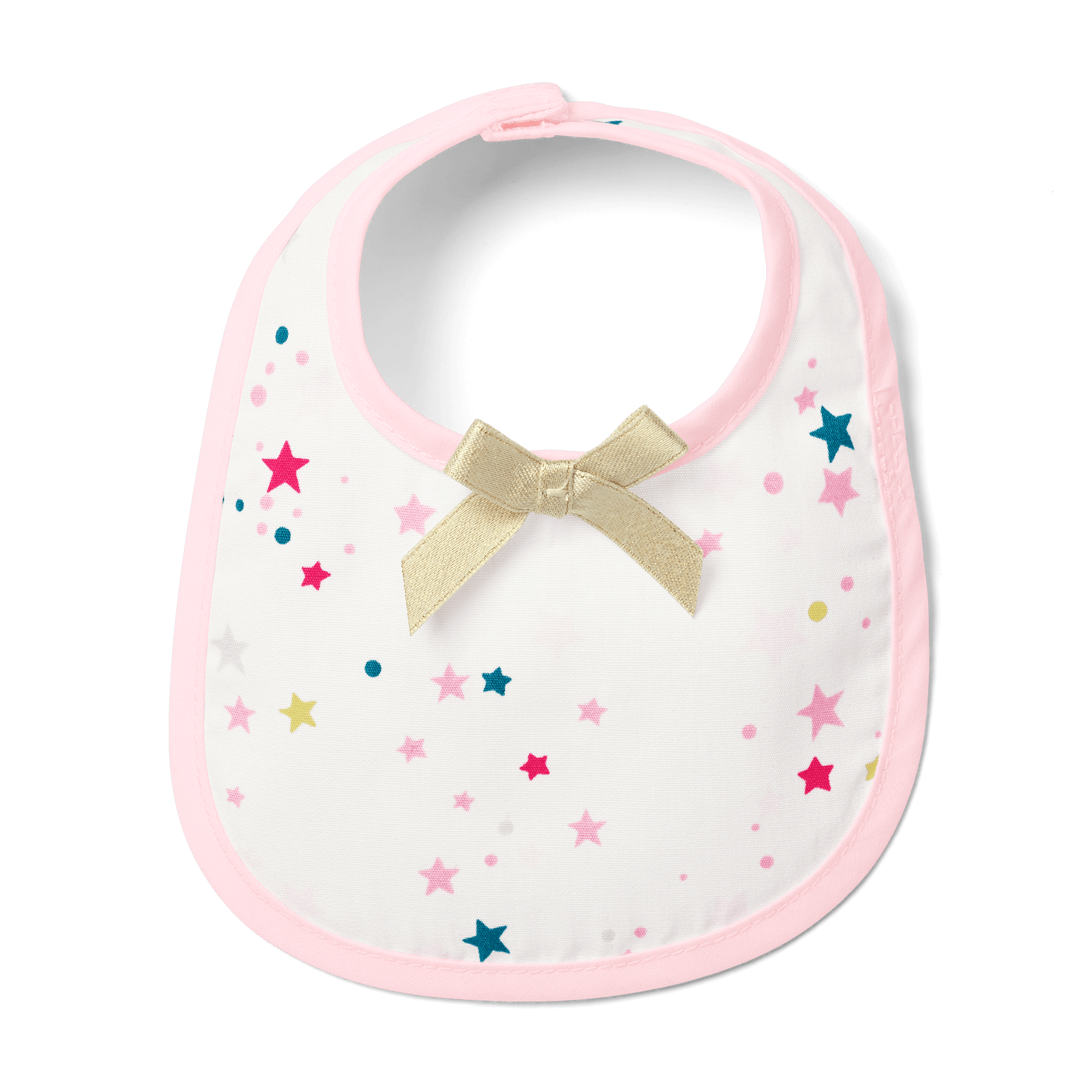 Help protect Bitty Baby’s cute clothes from mealtime messes with this star-print bib that has a gold bow on the front and secures in back.