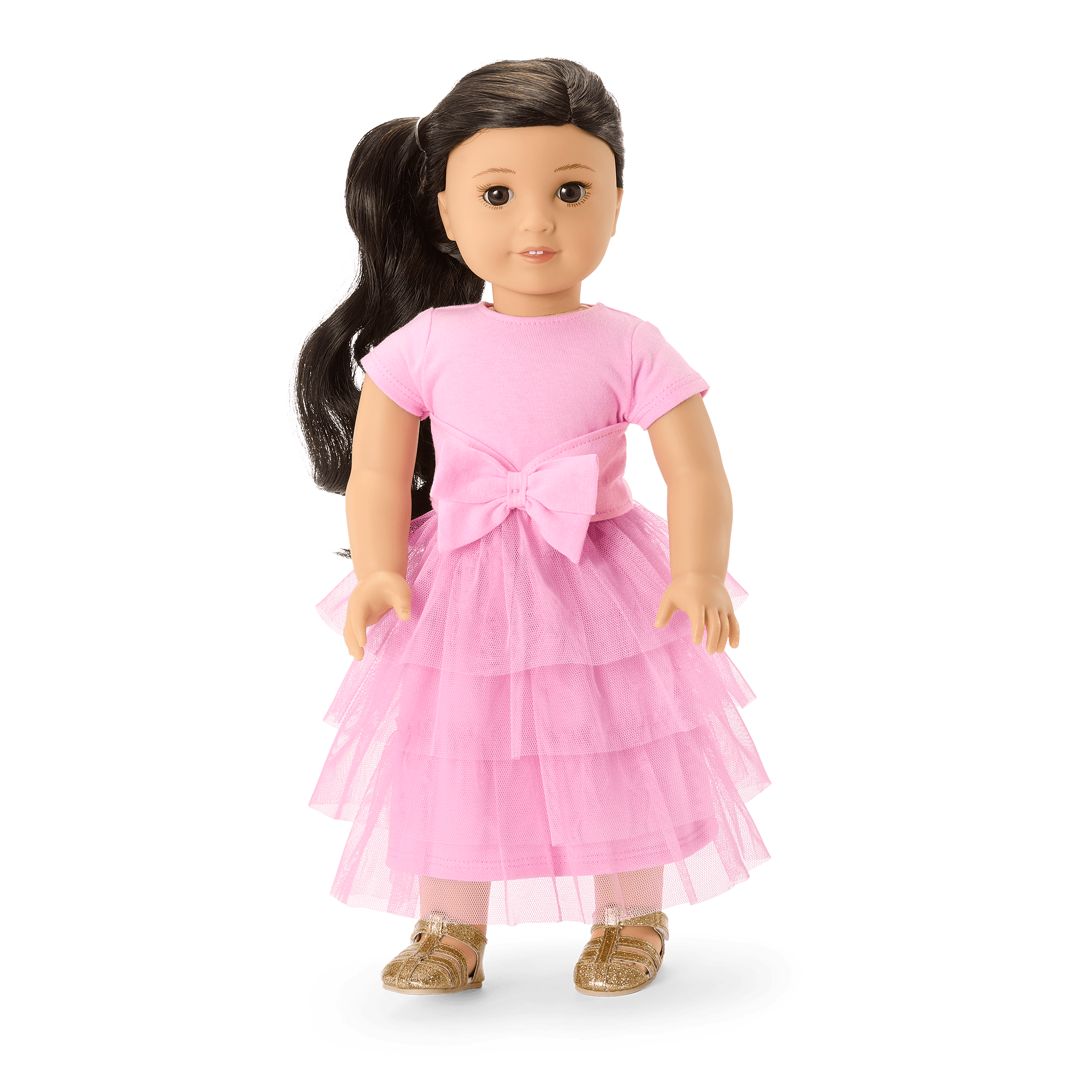 A pastel pink short-sleeve jersey top with a statement bow detail at the waist and a matching ankle-length tiered tulle skirt