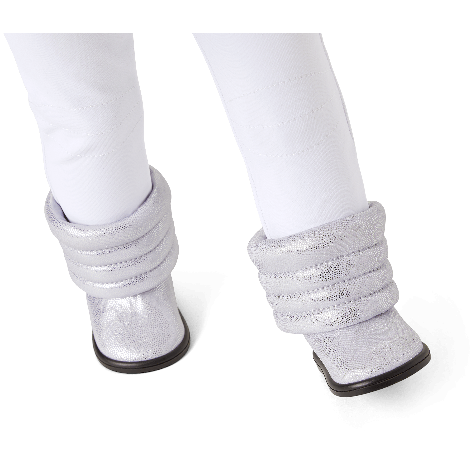 A white zip-front bodysuit with sparkly-pink puffy accents and a Crystal Starshooter logo on the chest