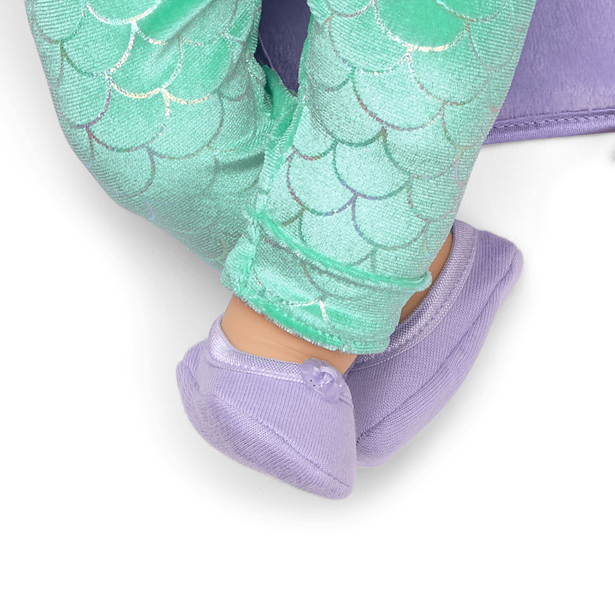 A romper featuring a lavender sparkle-knit bodice with a center shell, satin binding at the neckline, mesh ruffles at the sleeves, a mesh peplum waist, and aqua-colored velour pants with an iridescent scale print