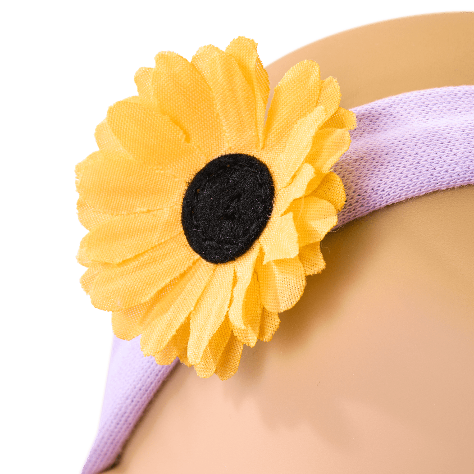 A pair of lavender cotton-jersey Mary Jane shoes with pink crisscross straps and gold bows at the toes