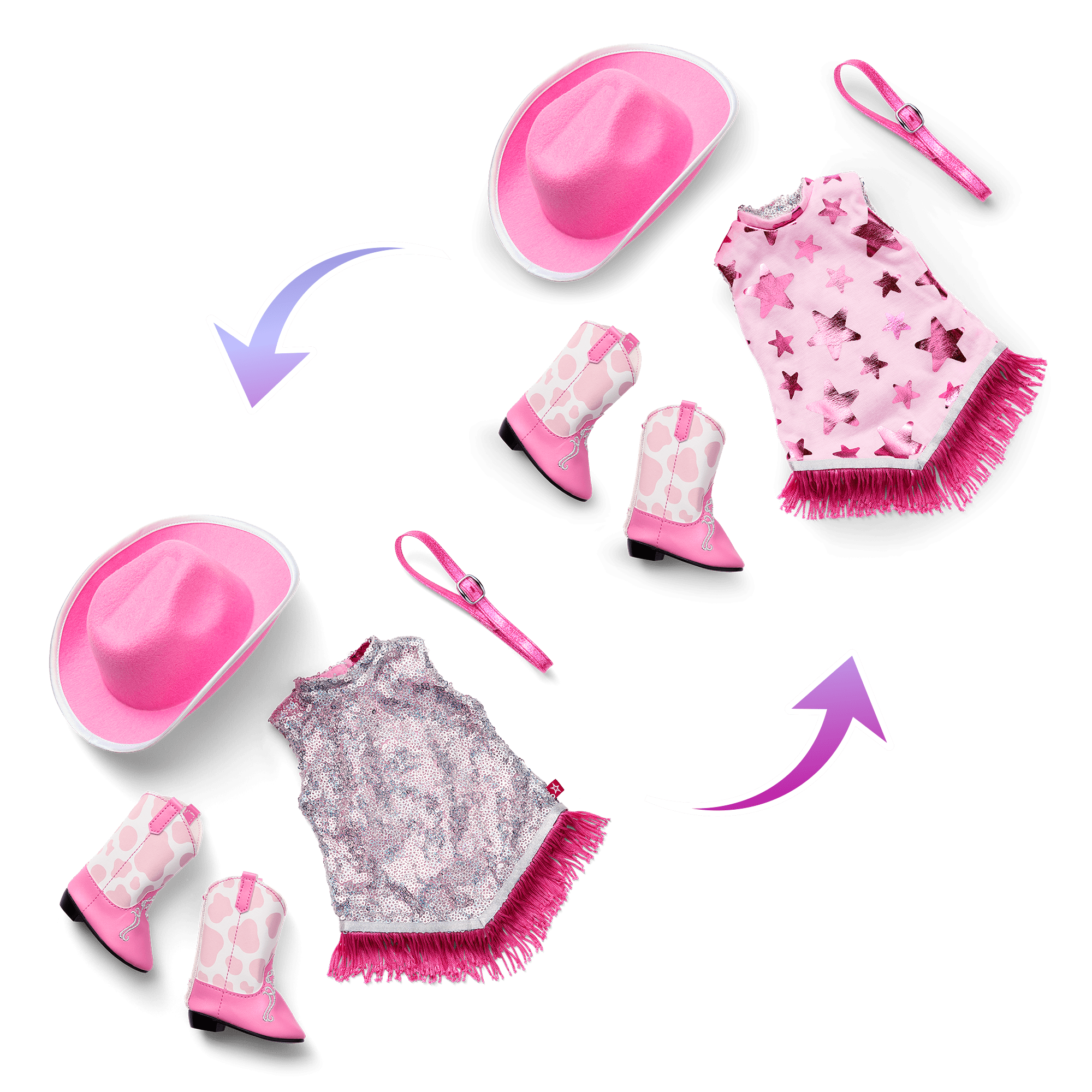 Two-step and twirl in this country-chic transforming outfit. This 18-inch doll outfit and accessories set is part of our Style Flips line with reversible features that create distinct looks. Pair this fashionable cowgirl outfit with the Pink Spotted Cow Backpack & Accessory Set (sold separately).