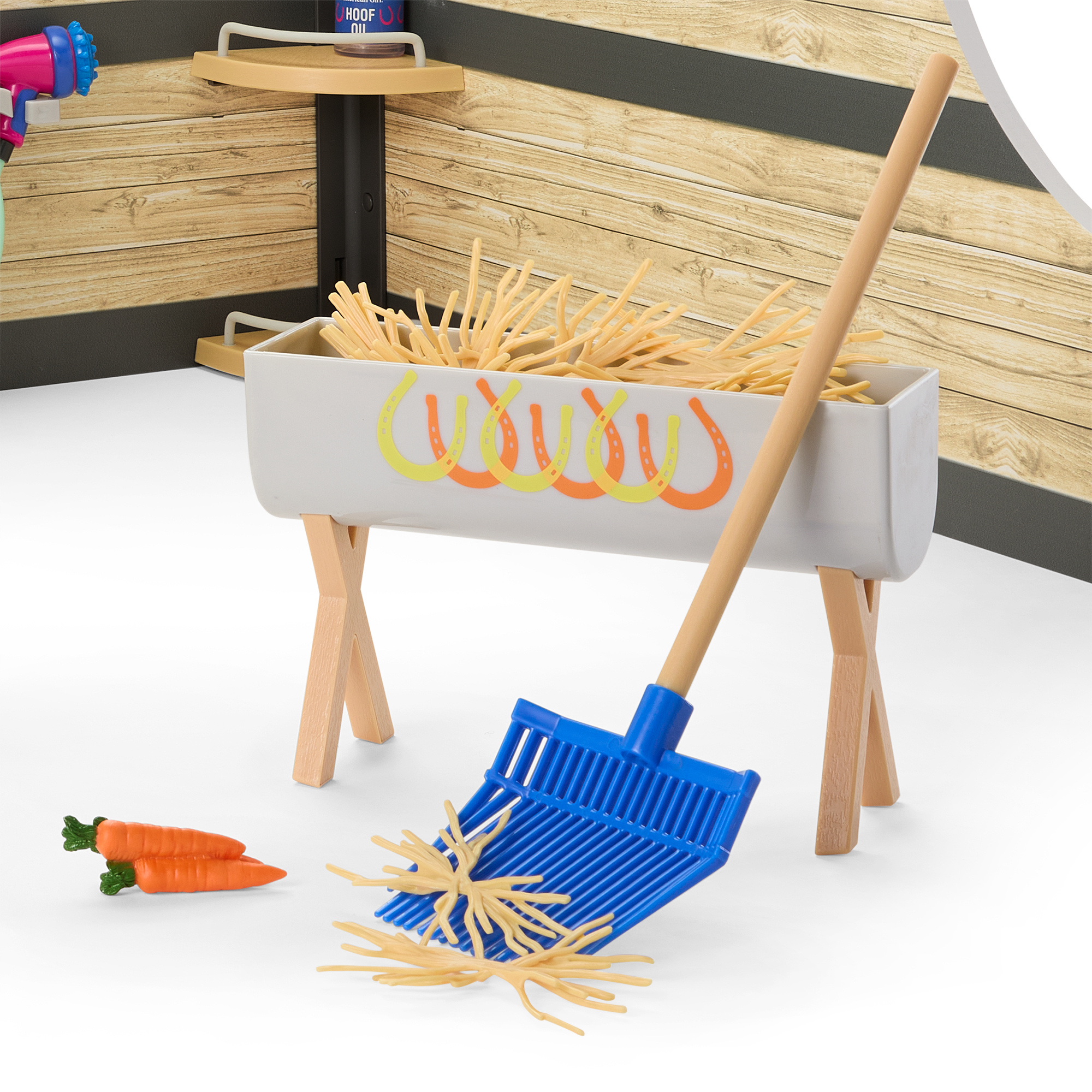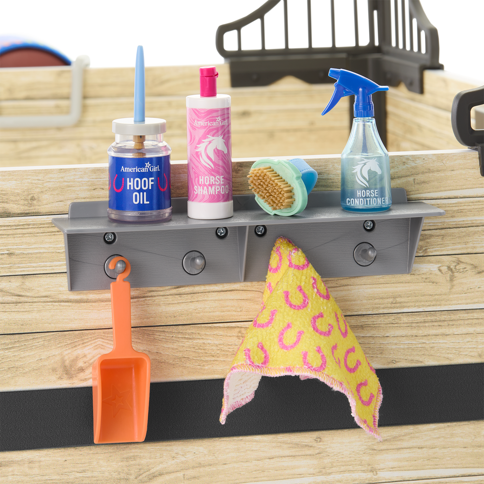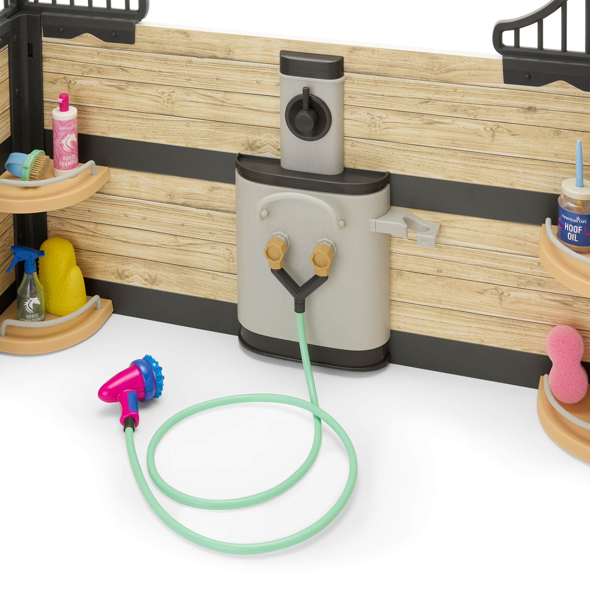 A grooming stall that features a horse enclosure with wooden fencing and metal-look railing details, built-in corner shelving for supplies, and a washing station with a pretend hose with valve and sprayer. A shelf on the washing station can hold small items like conditioner, brush, and carrots. The exterior of the stall includes built-in hooks for storing supplies, floral artwork, and a dimensional Honeycrisp Hill Farm sign on the front.