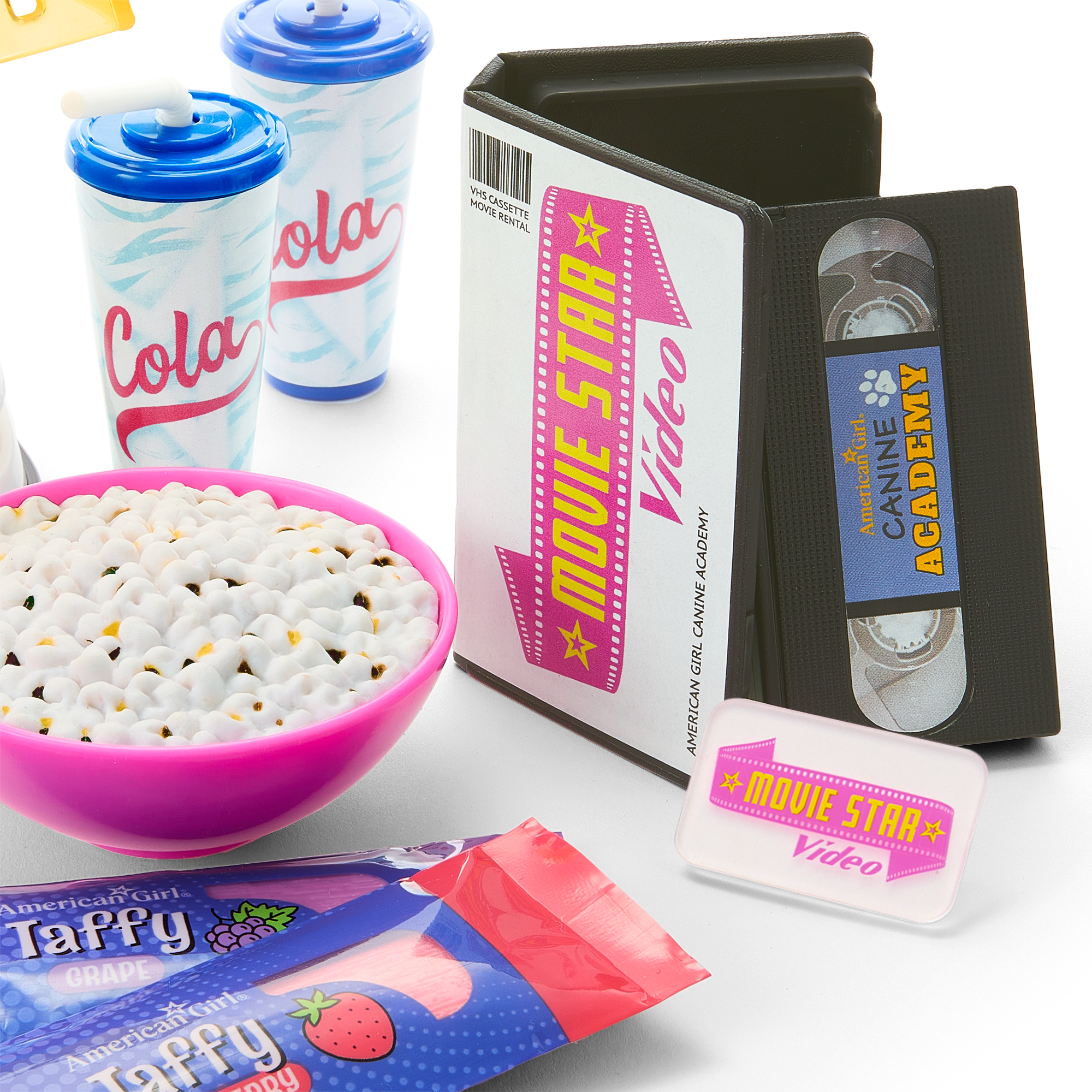 A faux VHS tape in a case featuring the made-up movie American Girl Canine Academy and a video rental membership card to “Movie Star Video”