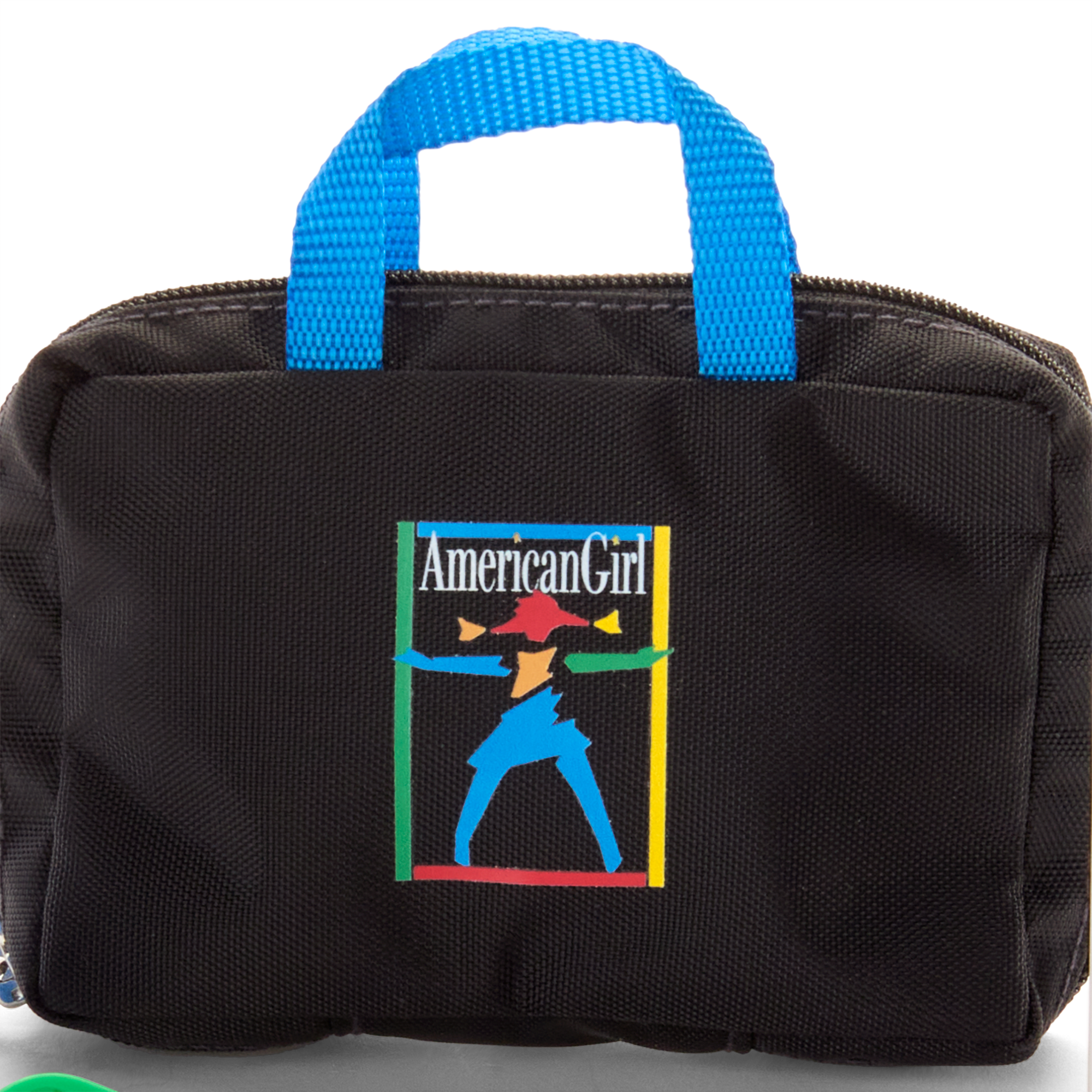 A black duffel-style tote bag with blue handles and the 1990s American Girl multicolored logo on the front