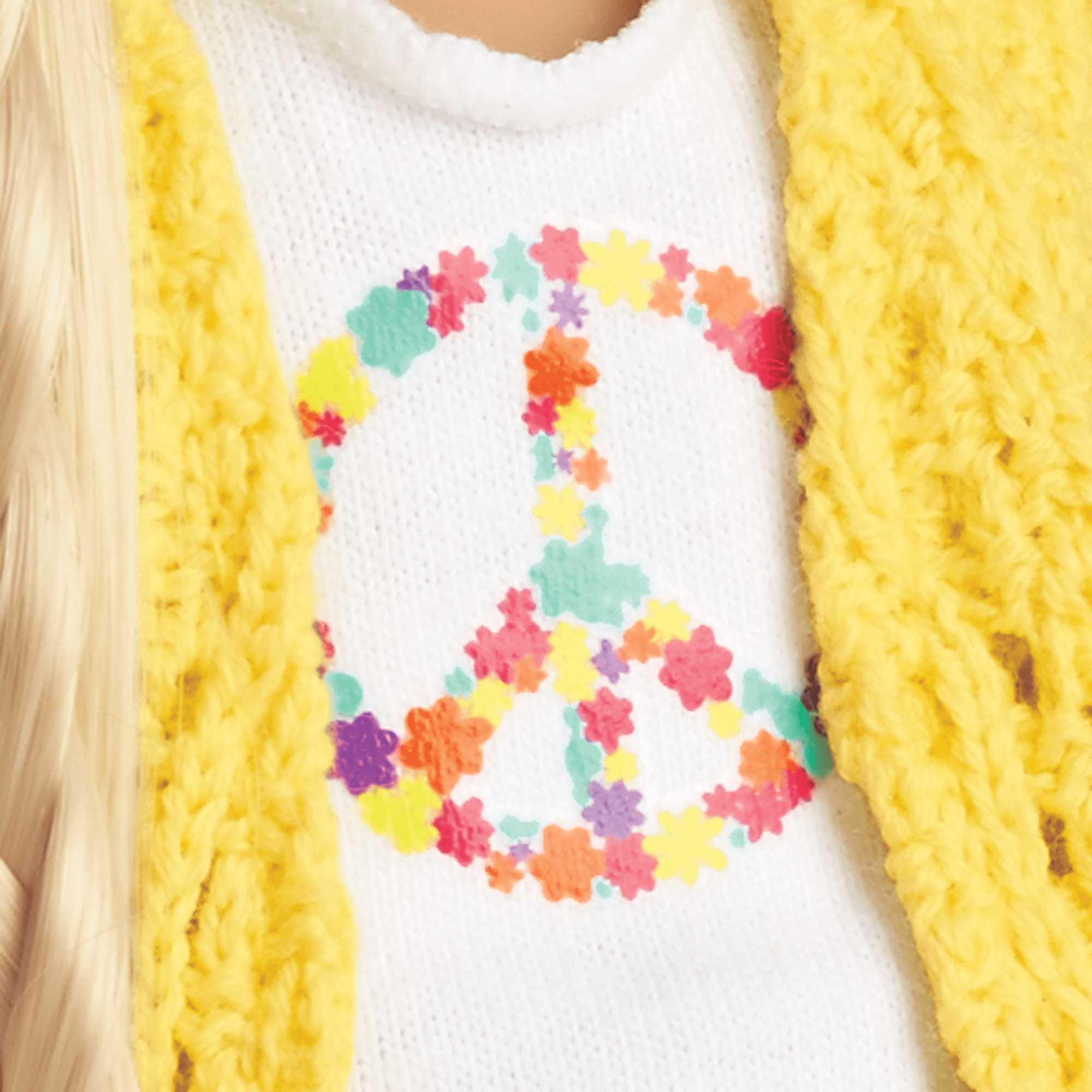The 6.5″ (16.5 cm) Julie mini doll has warm brown painted eyes and shiny blond hair. Her smooth vinyl limbs are posable. She arrives in a tiny version of Julie’s authentic ’70s outfit featuring a crocheted vest, a peace-sign tank top, and jeans. Includes a mini abridged version of the book The Big Break.