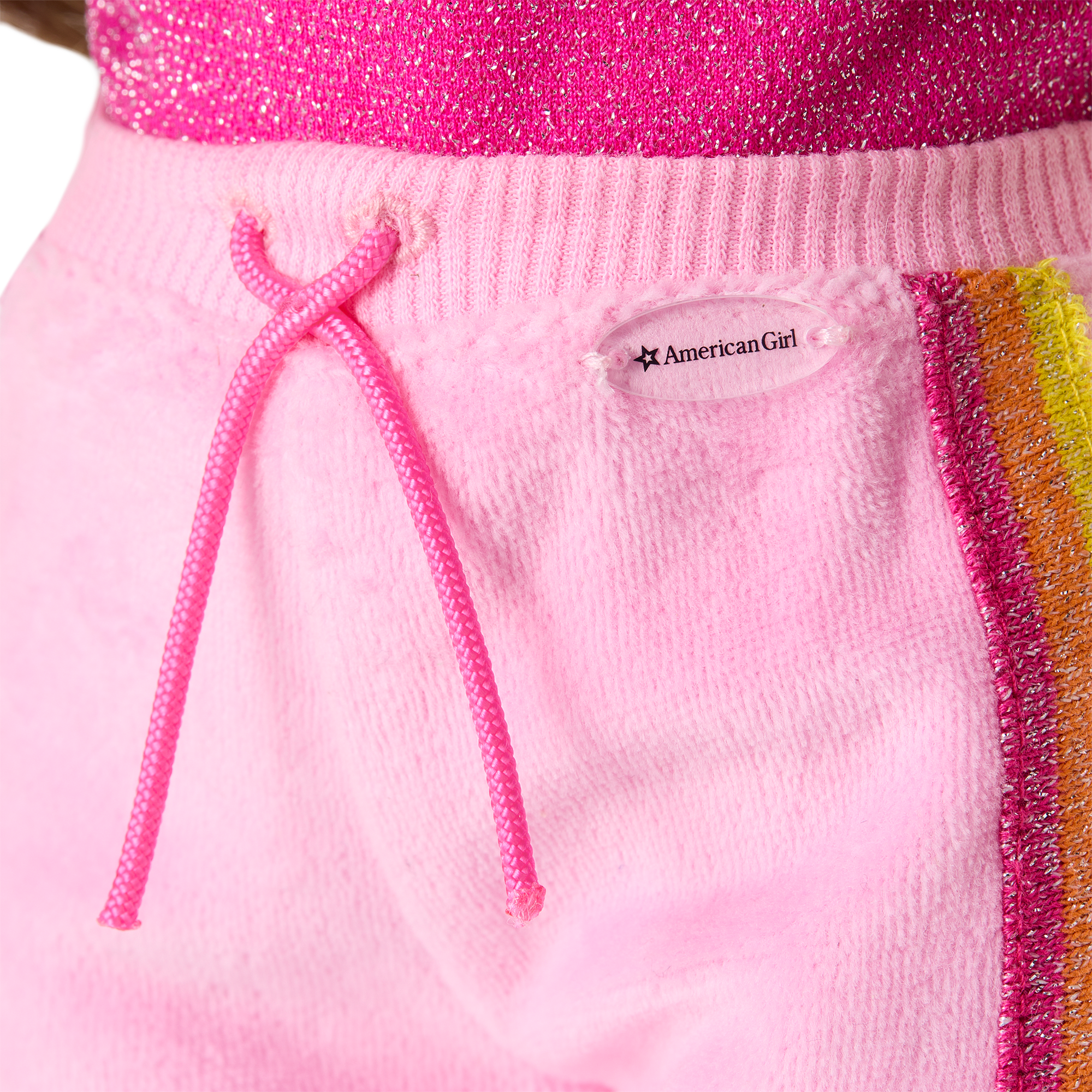 A sparkly pink knit mock turtleneck tank top, pale-pink track pants with sparkly striped trim on the sides, light-purple platform sandals, and a pair of underwear