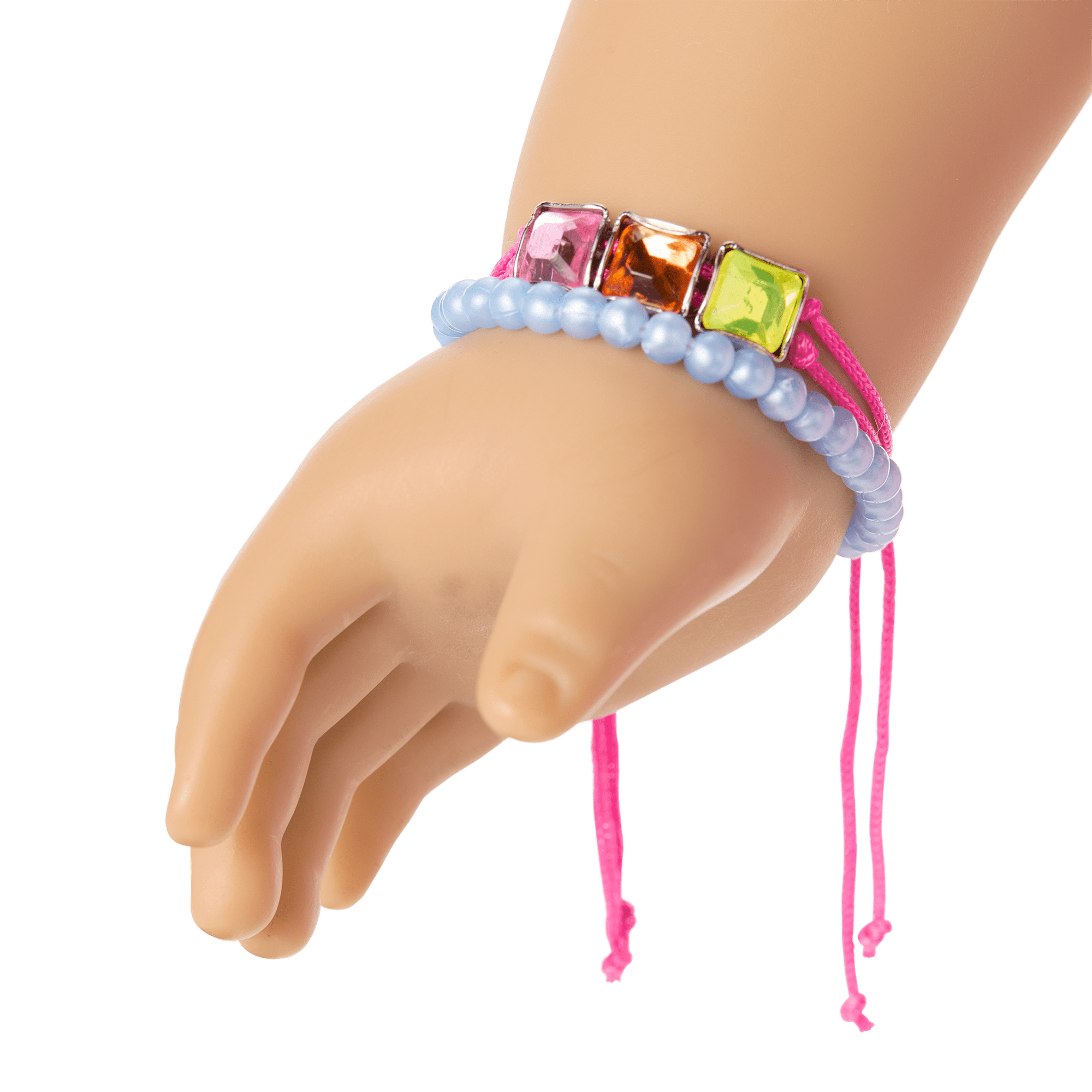 A blue beaded bracelet, a pink cord bracelet with three multicolored gems, and two soft-pink hairbands