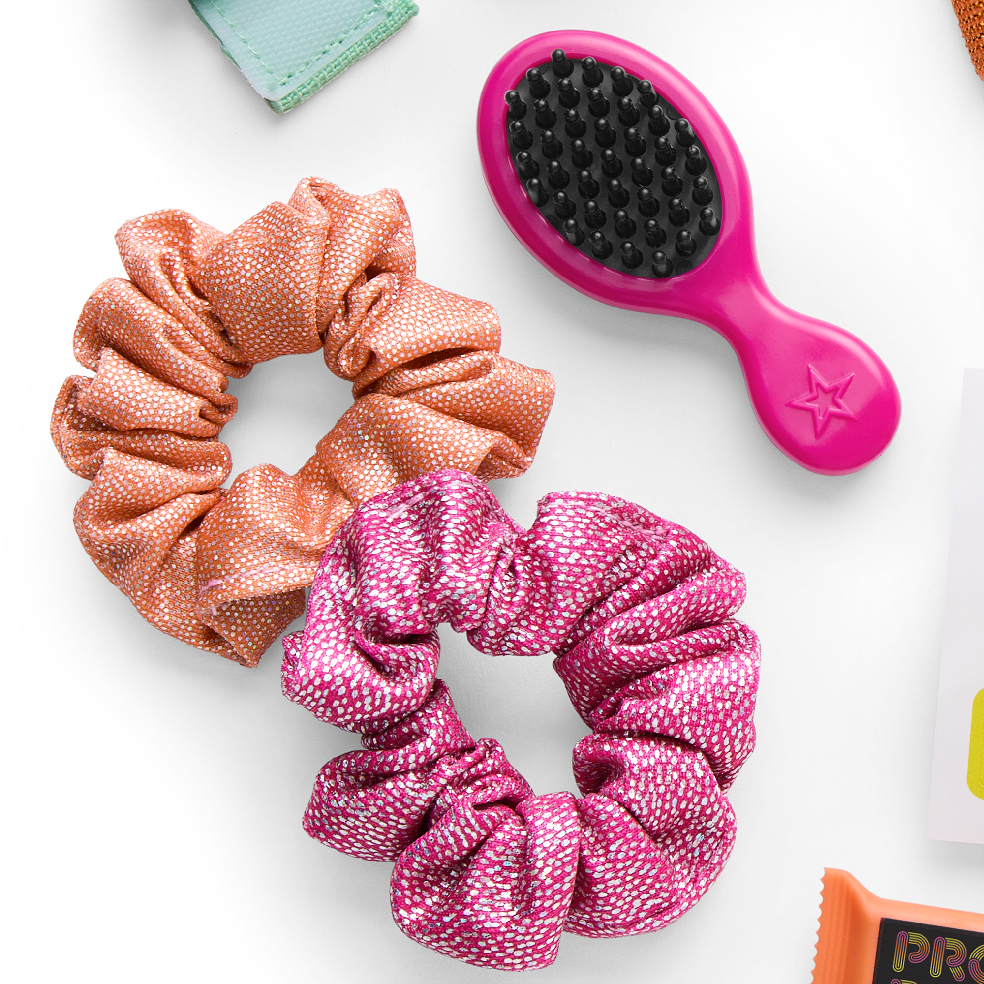 A sparkly pink scrunchie, a sparkly orange scrunchie, a pink elastic headband with silver stripes, and a pink doll-sized travel brush