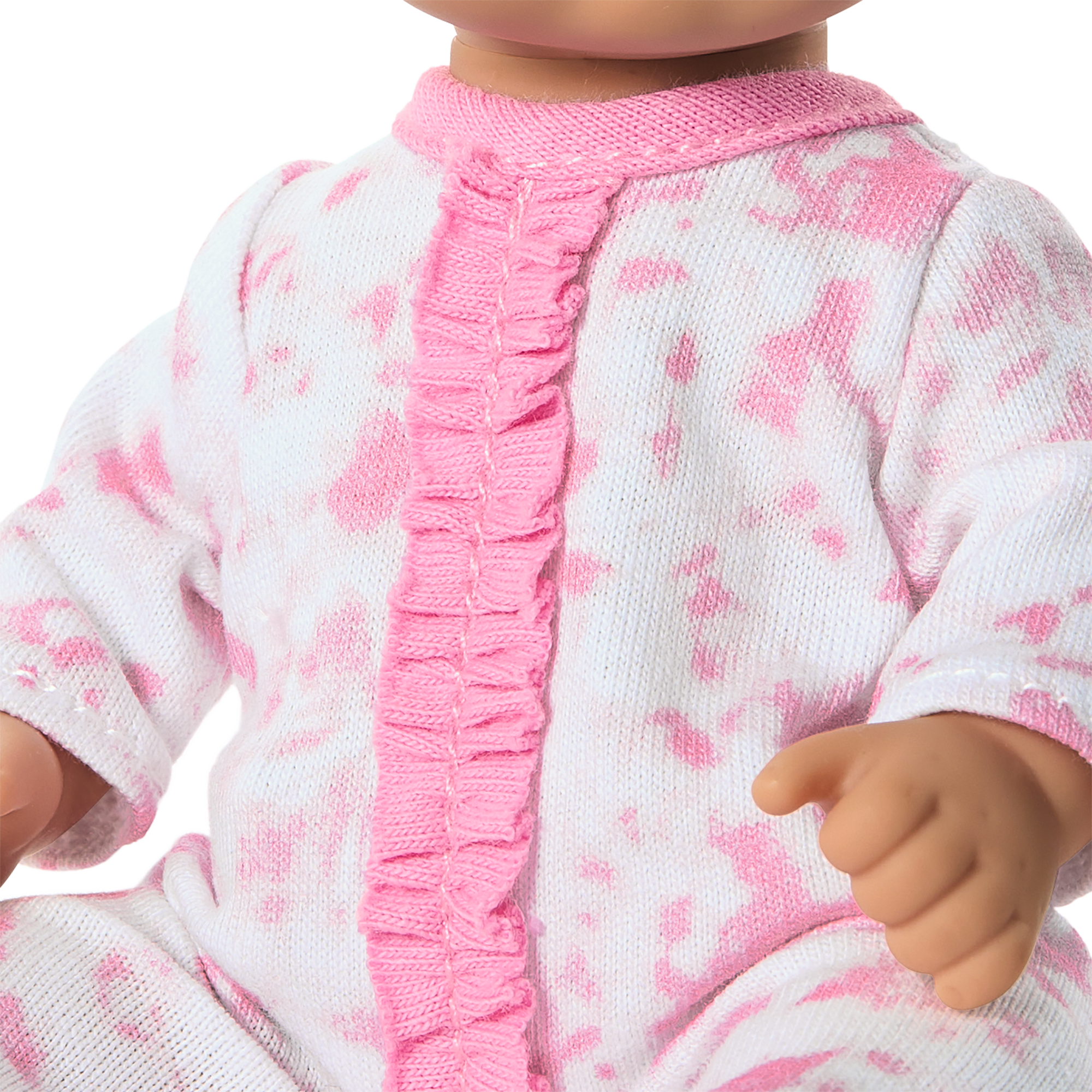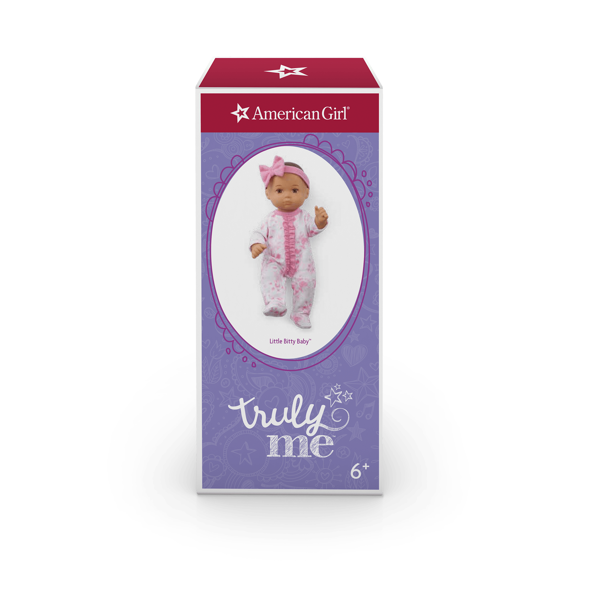 A 7.75-inch baby doll with movable arms and legs, and a head that turns. Little Bitty Baby arrives wearing a pink tie-dye sleeper, a diaper, and a pink headband with a bow.