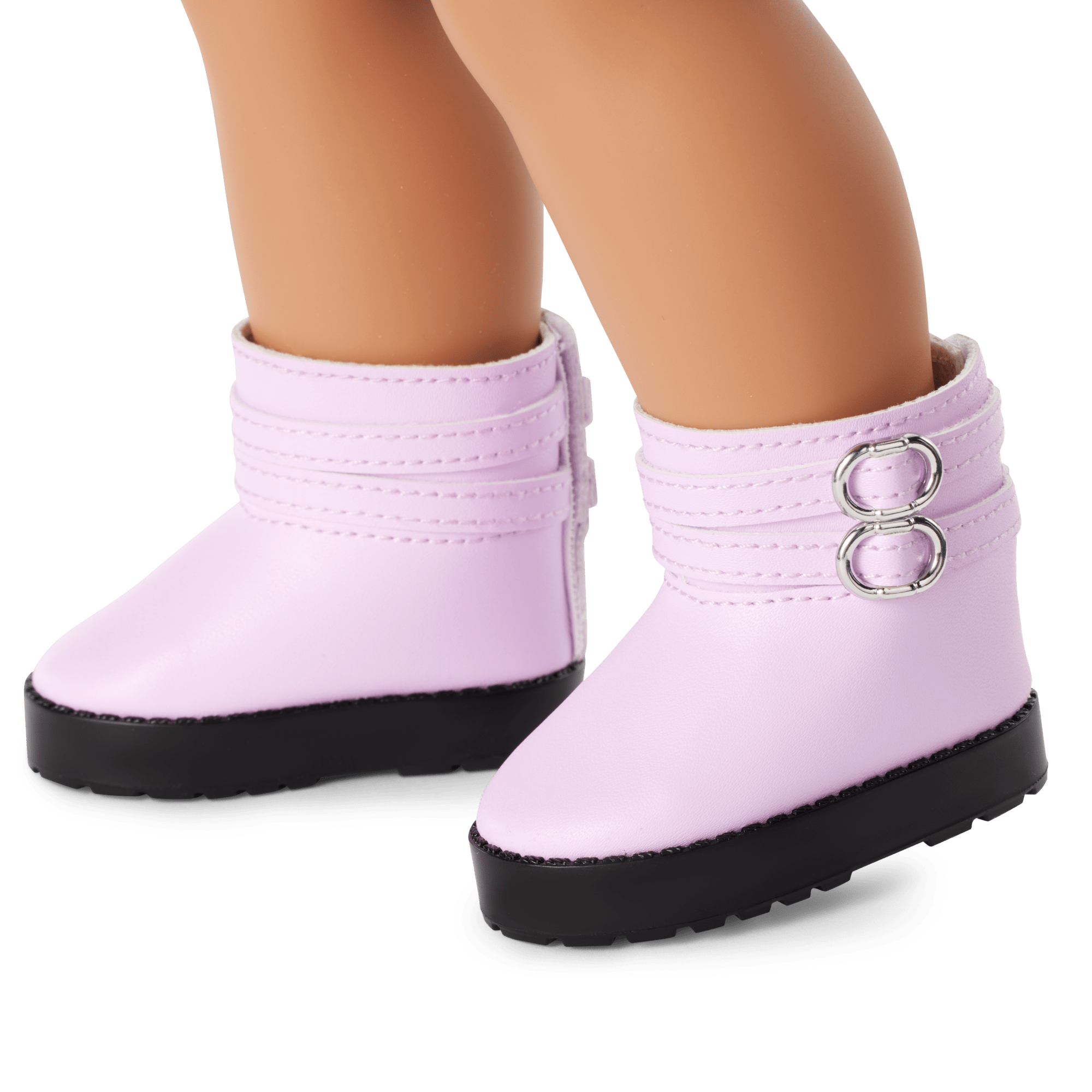 A pink, purple, and green striped mock-neck tee, a pink vinyl skirt with a silvery zipper front and faux pockets, a pair of pink cotton underwear, and a pair of lavender vinyl ankle-strap platform boots