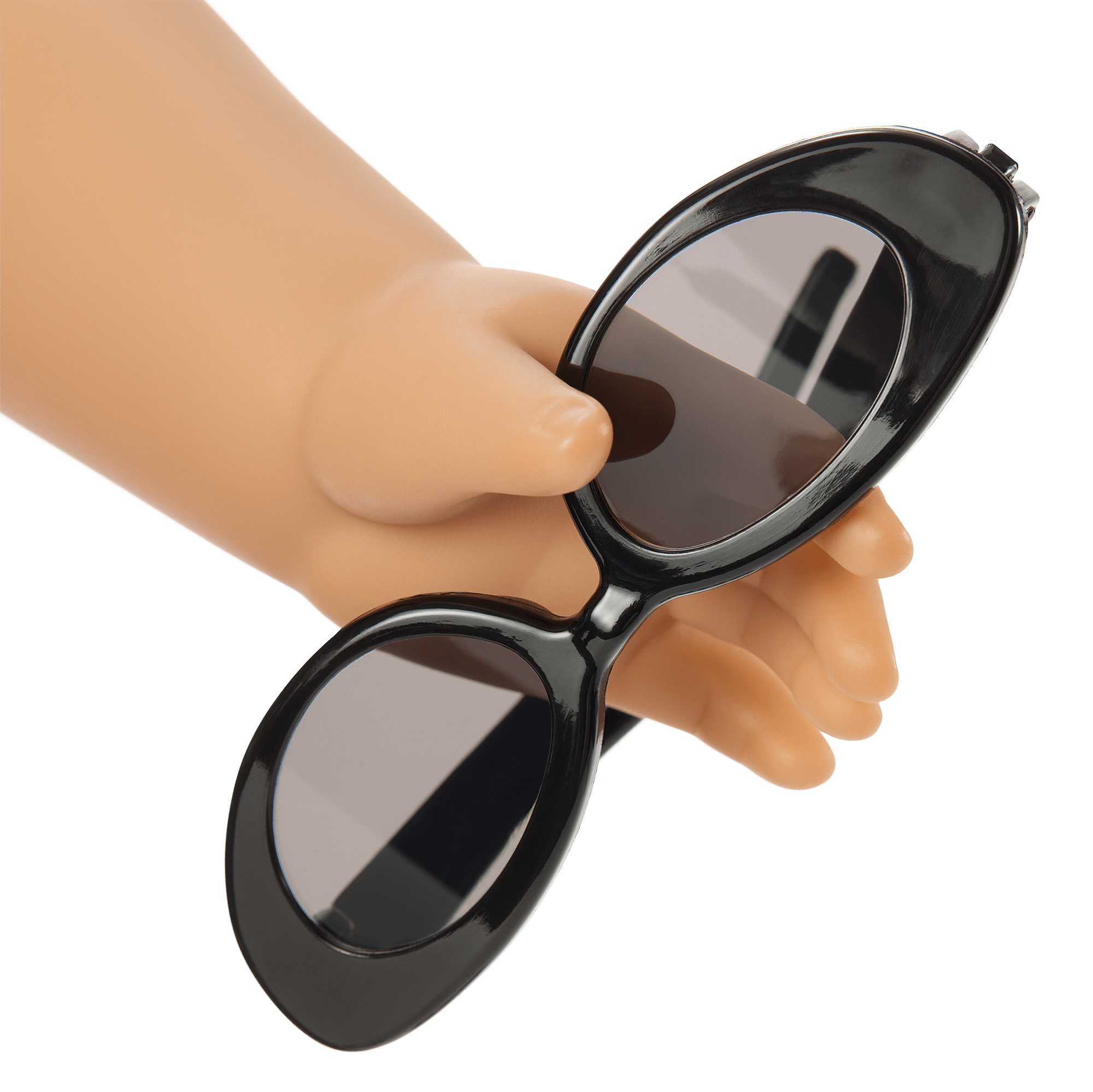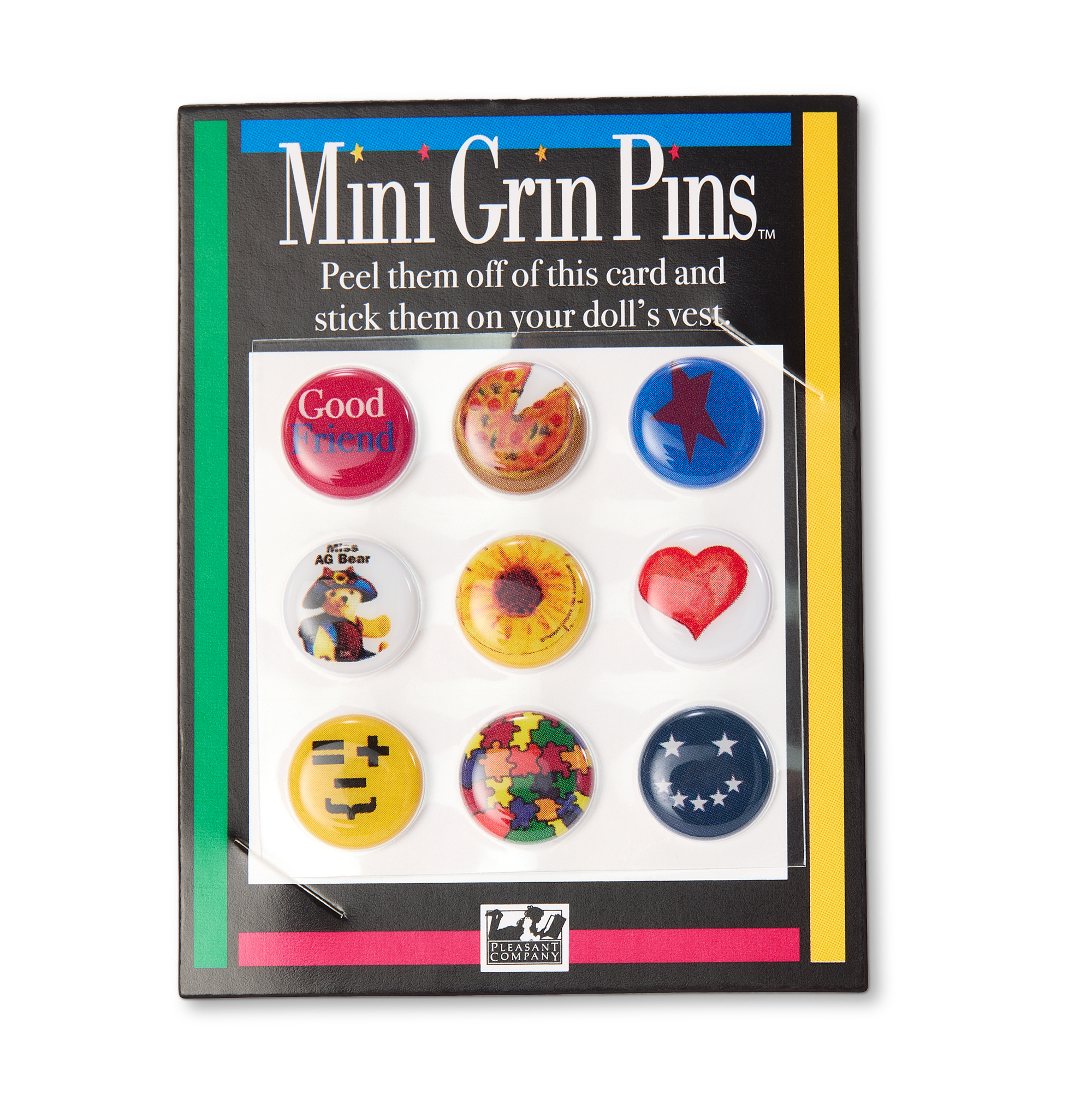 A twill baseball hat with faux mini American Girl Today Grin Pins attached, black oval-shaped sunglasses with transparent lenses, and a ribbon necklace with a yin-yang pendant