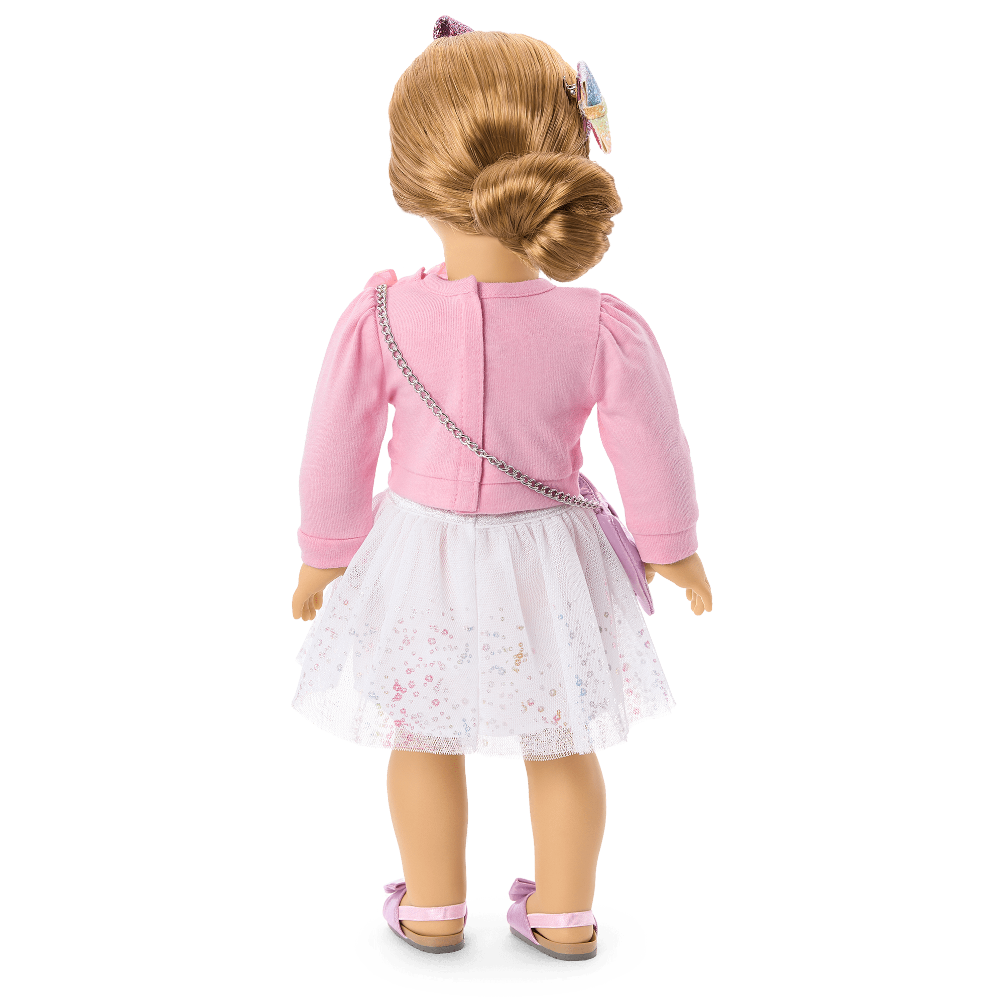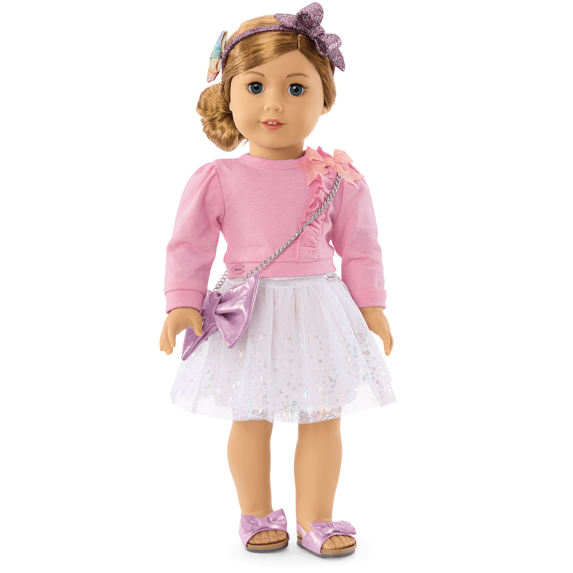A pink long-sleeved cotton jersey top with an asymmetrical ruffle topped with a light pink iridescent bow on the left shoulder