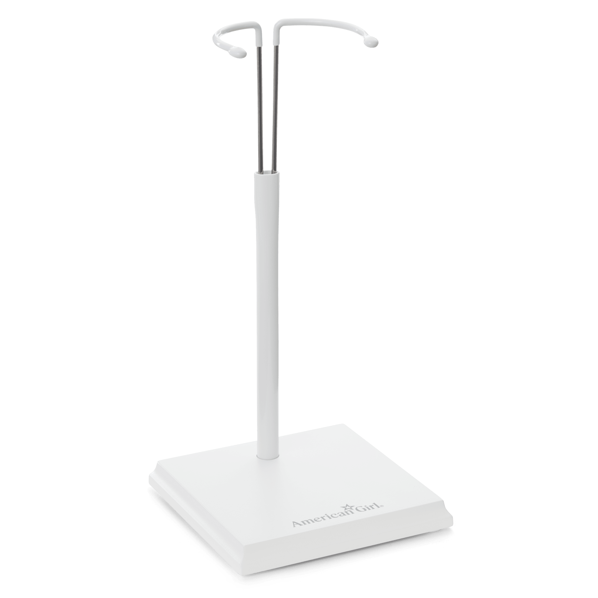 This doll stand makes it easier to play with and display an 18″ doll. It has a square wooden base and a metal holder that can extend to 11” tall.