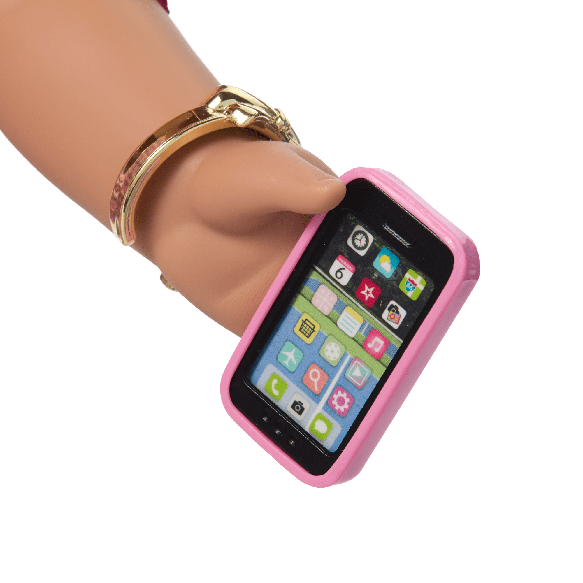 Raquel’s Accessories for 18-inch Dolls: A golden necklace that matches Samantha’s original brooch locket, a diary that used to belong to Samantha with some of her writing inside, a photo of Samantha, a photo of Samantha’ house, and a recipe card, a canvas tote bag with Raquel’s name embroidered on the front, a pair of pink sunglasses, and a faux cell phone