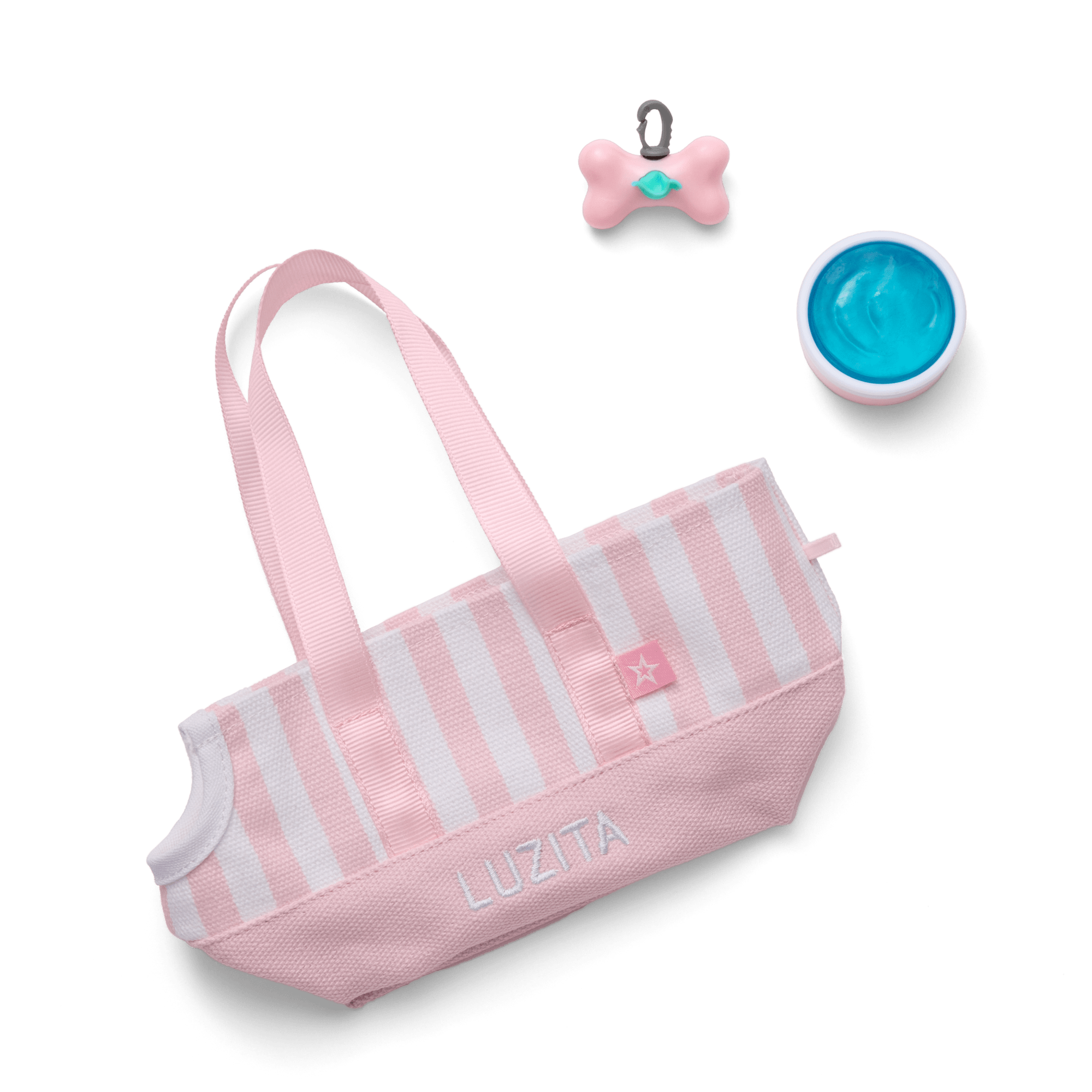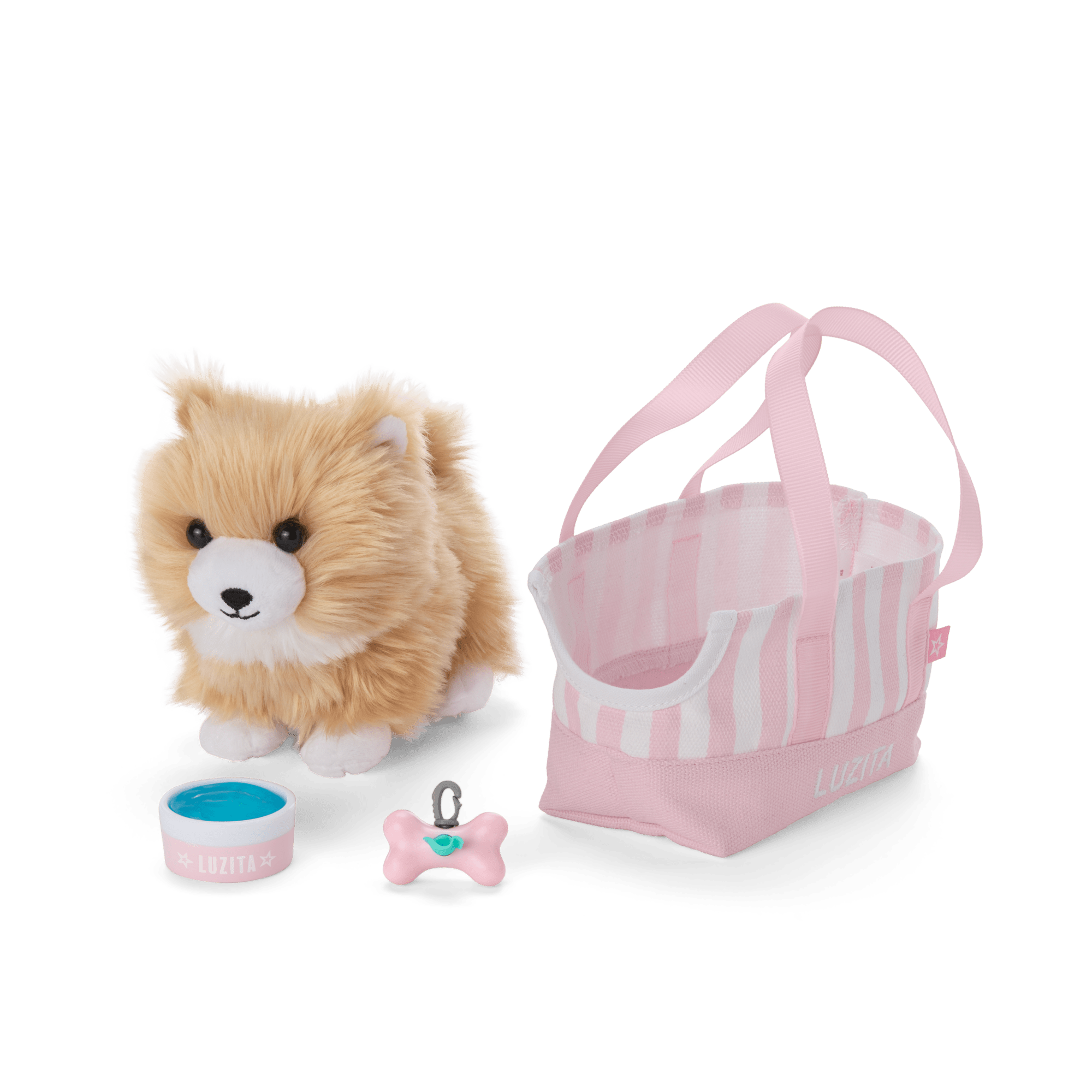 Raquel’s Dog, Luzita: A plush Pomeranian dog with fluffy light-brown fur and a white chest, a tote-bag dog carrier with Luzita’s name embroidered, a poop bag holder, and a water bowl
