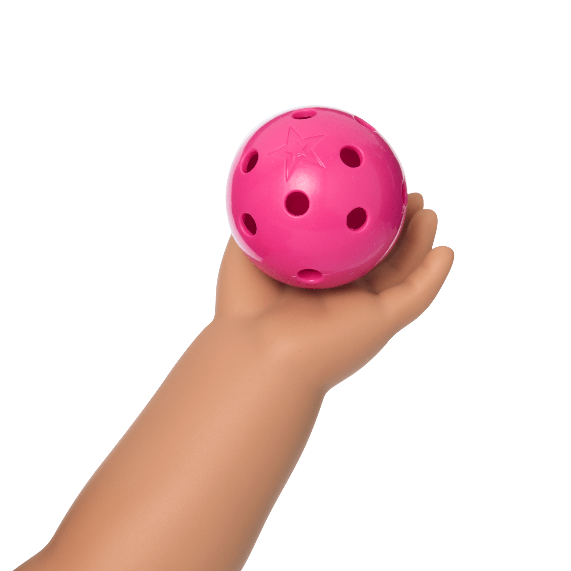 Raquel’s Pickleball Bag & Paddle Set for 18-inch Dolls: A pair of pickleball paddles dolls can hold; a pickleball bag with a front zipper pocket that can hold the racket; three pink pickleballs; a water bottle; and a teal visor with a transparent pink bill and an embroidered AG logo