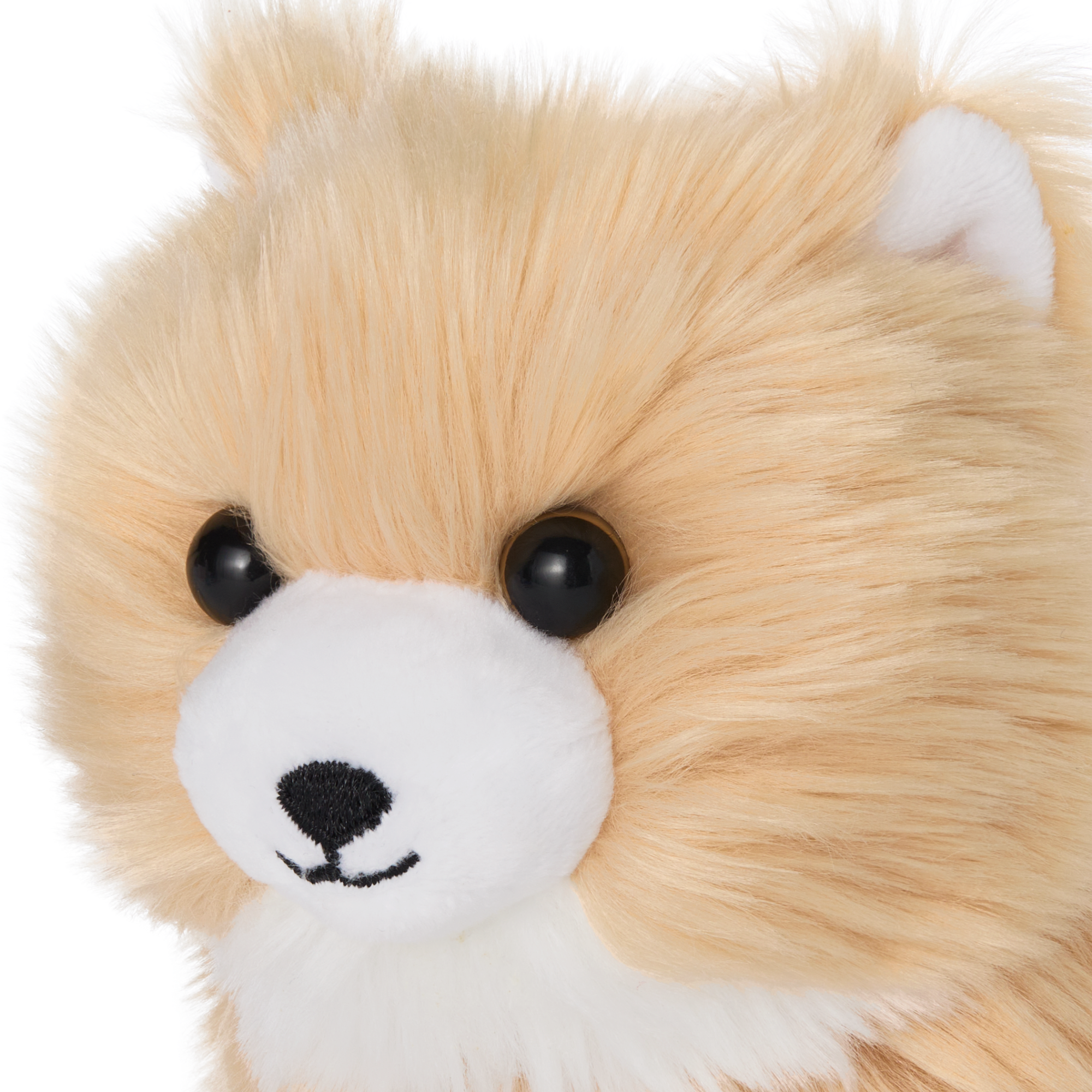 Raquel’s Dog, Luzita: A plush Pomeranian dog with fluffy light-brown fur and a white chest, a tote-bag dog carrier with Luzita’s name embroidered, a poop bag holder, and a water bowl
