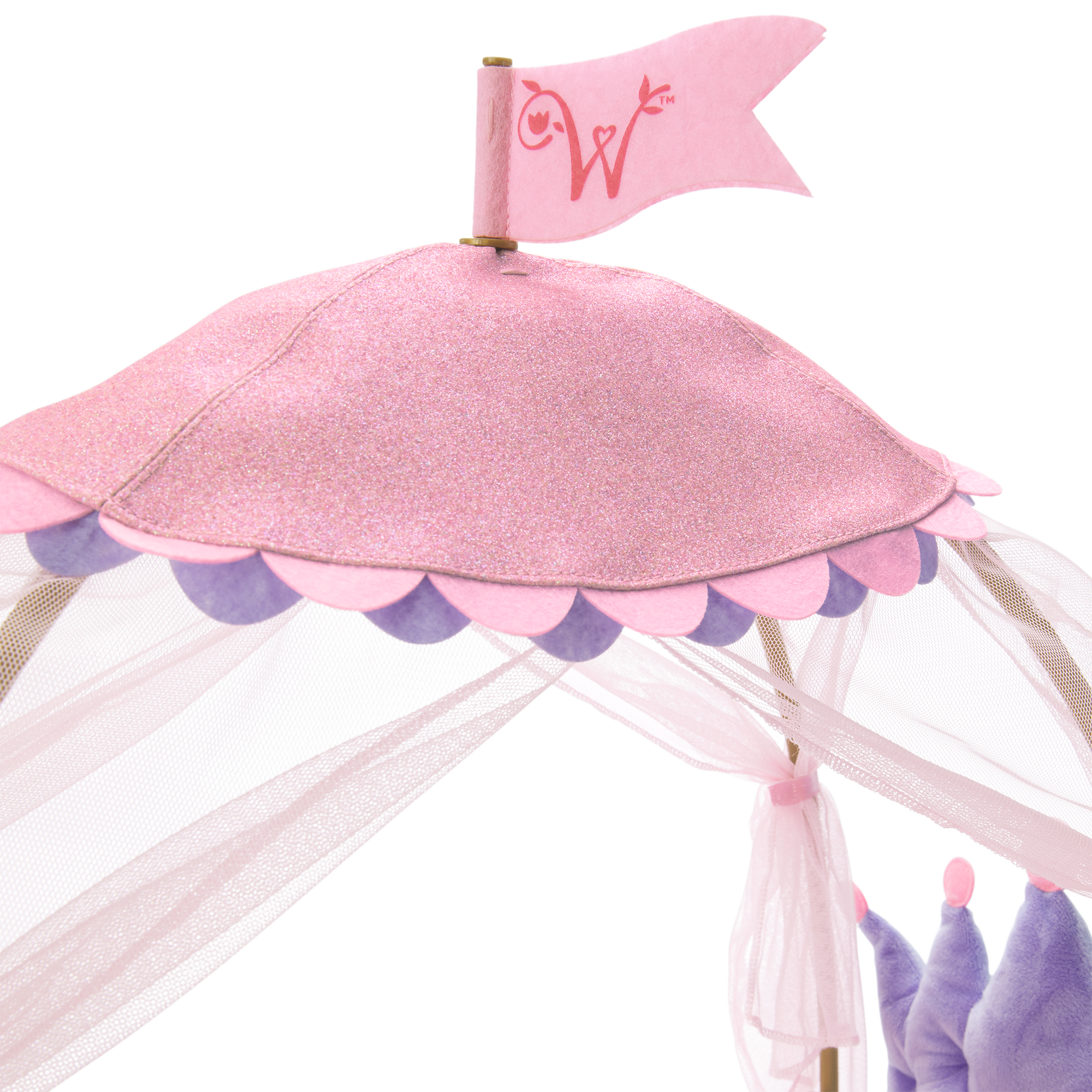 A sparkly canopy and support poles. Tie open the mesh drapes for lounging or close for an afternoon nap. A flag on top of the canopy features the WellieWishers logo.