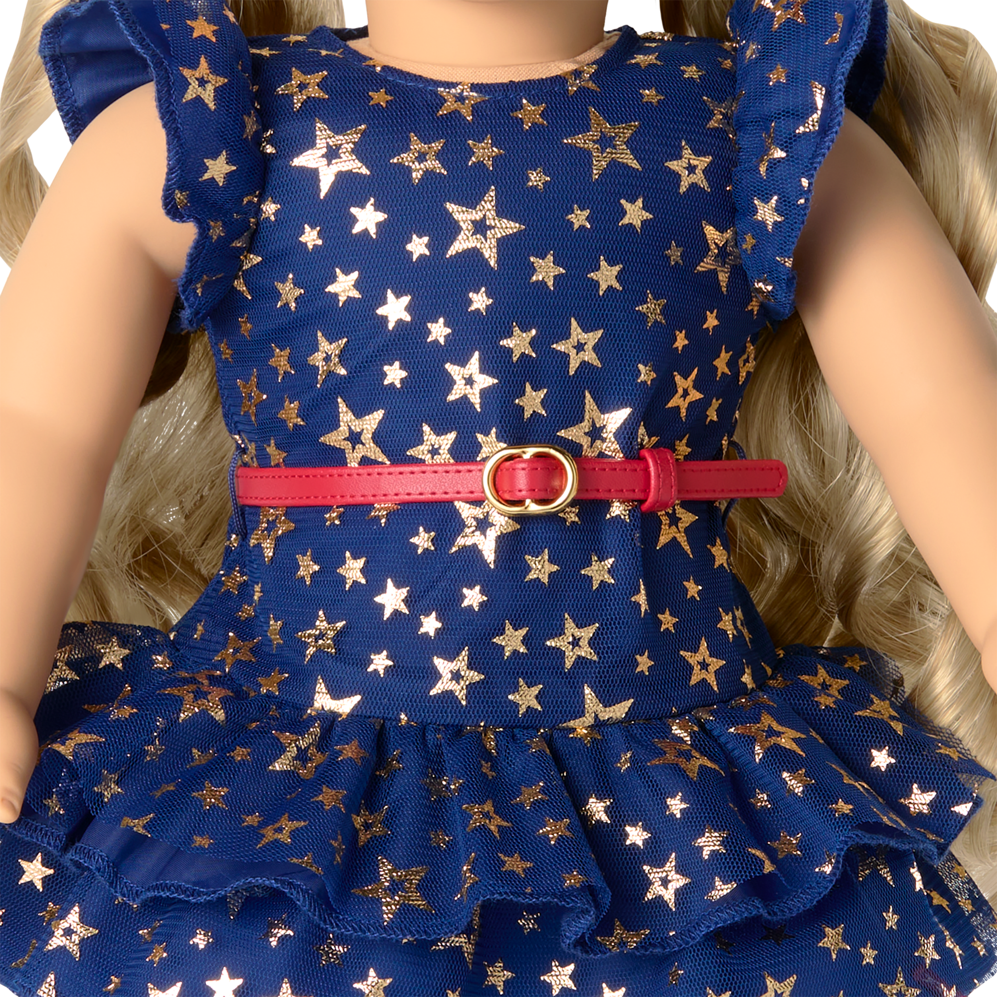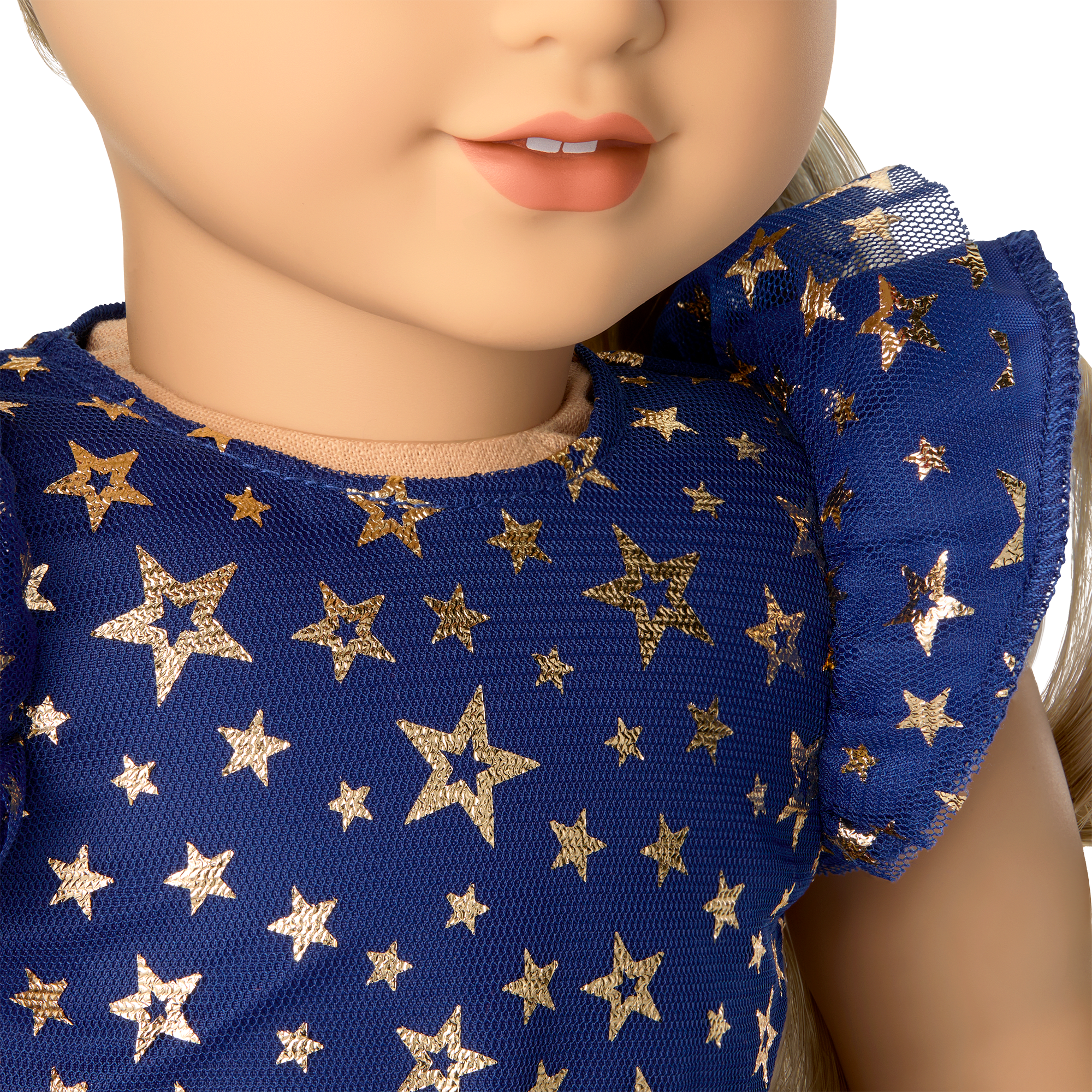 A navy mesh dress with allover gold foil star print, short mesh ruffled sleeves, a double mesh ruffled hem, and a navy interior lining