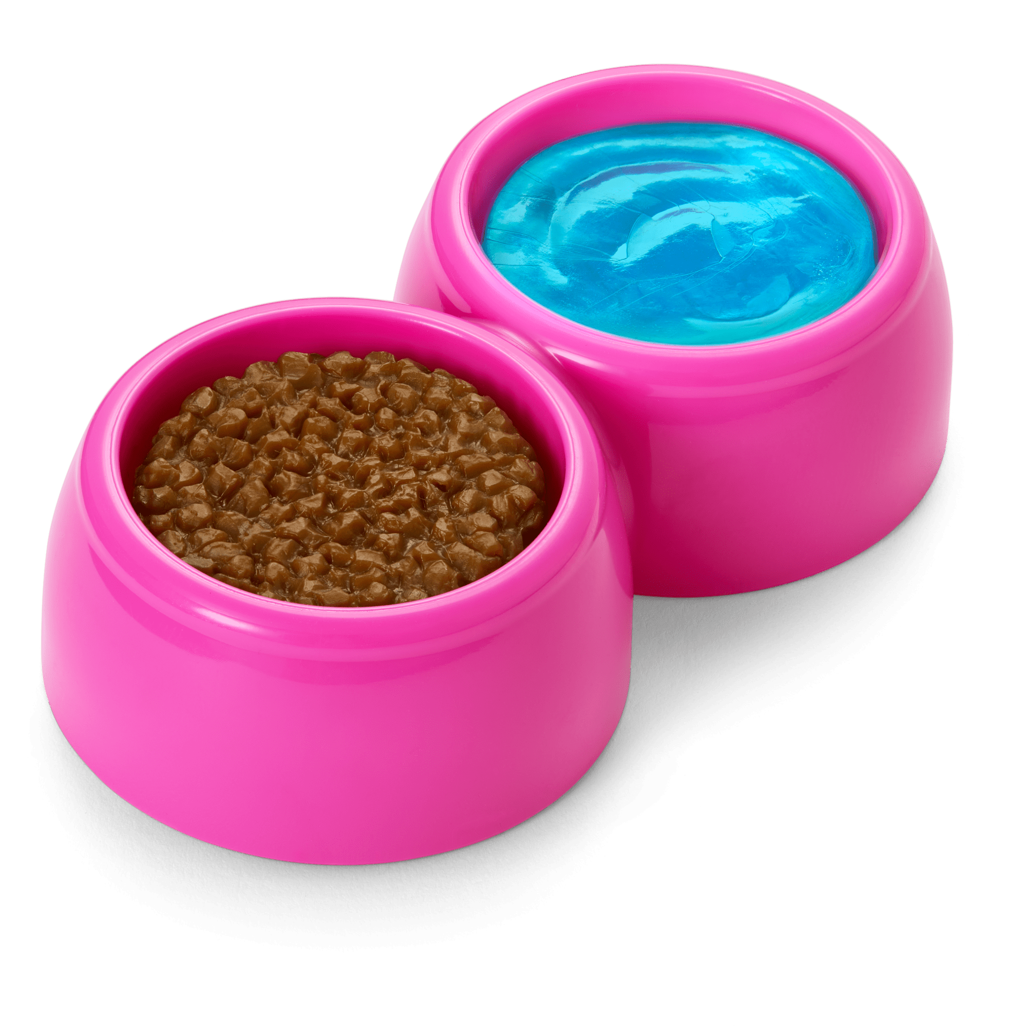 AG Star Squad Puppy & Accessories for 18-inch Dolls: A mini Coconut Chip plush puppy wearing a removable varsity dog jacket with an attached leash that dolls can hold, plus a food and water dish