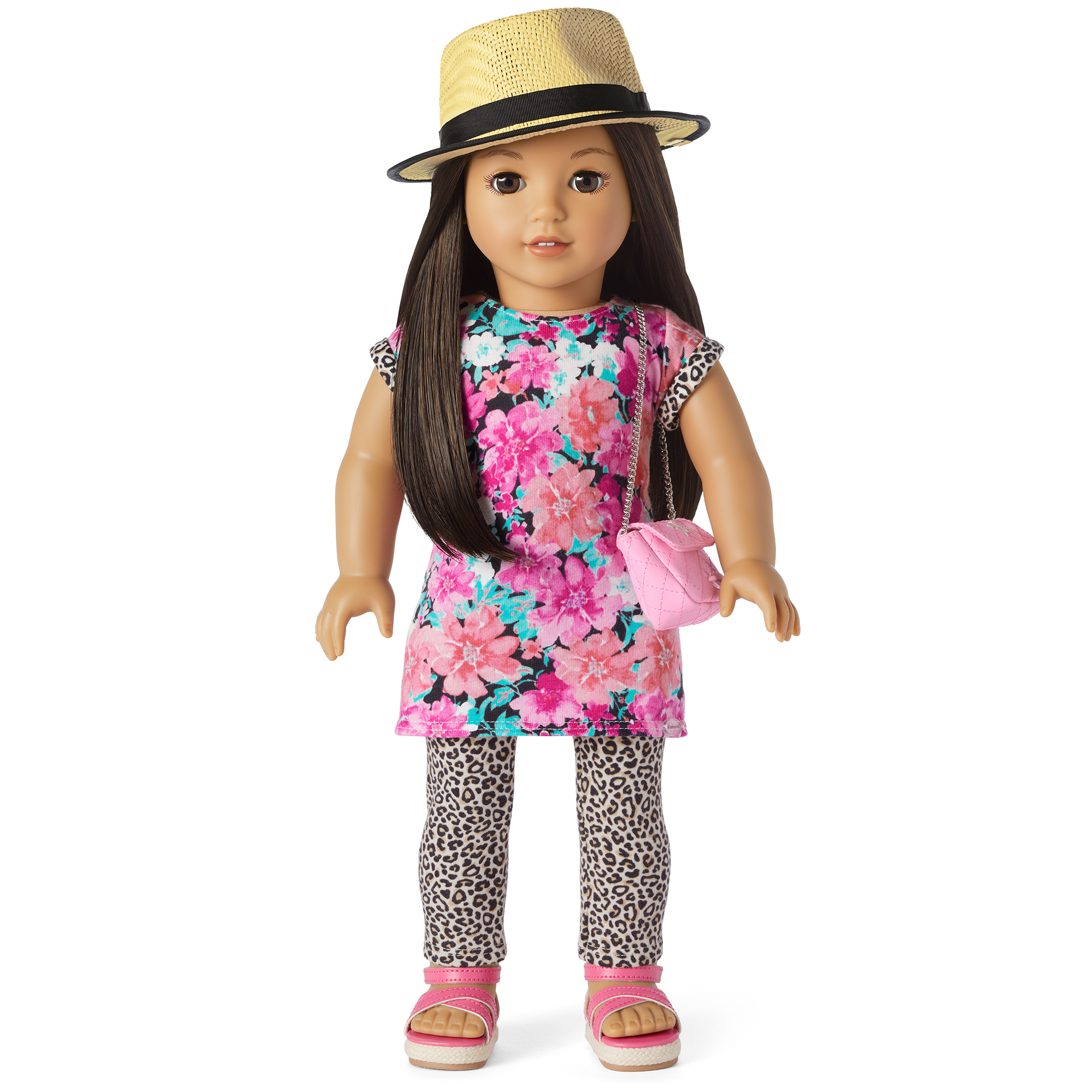 Show Your Sweet Side Accessories for 18-inch Dolls: A pair of calf-length leopard-print leggings, a straw hat with grosgrain ribbon trim, and a pink purse with a silver metal chain strap