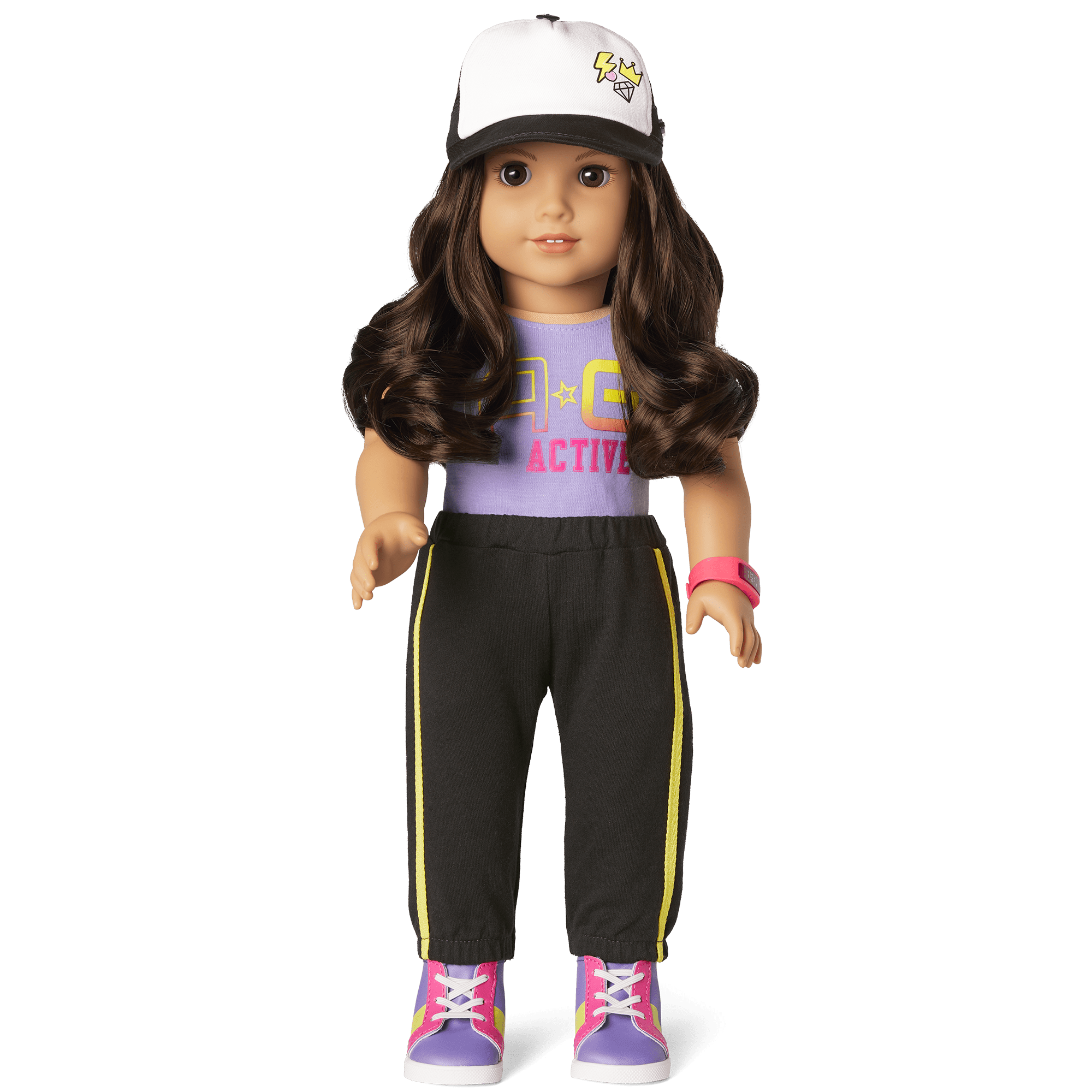 Show Your Sporty Side Accessories for 18-inch Dolls: A pair of black joggers with yellow twill tape stripes, a baseball cap with crown and gem graphics, and a faux fitness-style watch