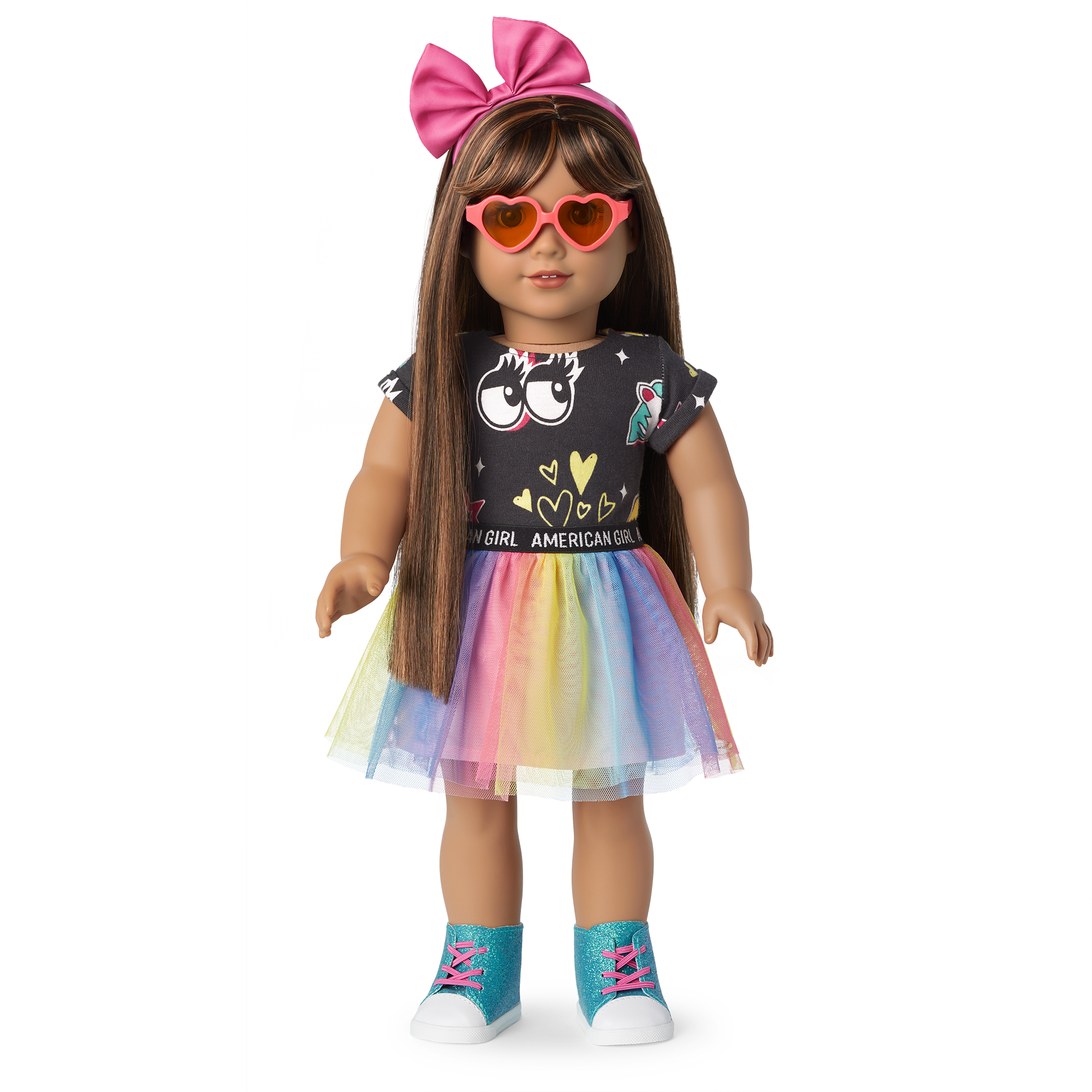 Show Your Wild Side Accessories for 18-inch Dolls: A rainbow mesh skirt with an “American Girl” waistband, a hot pink headband with a large pink bow, and a pair of heart-shaped sunglasses